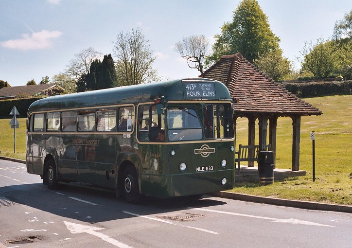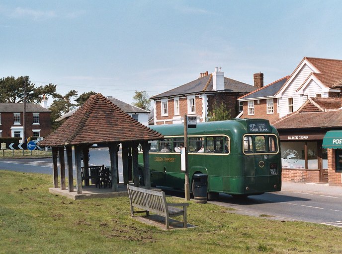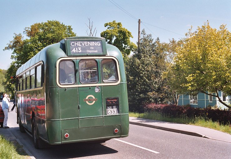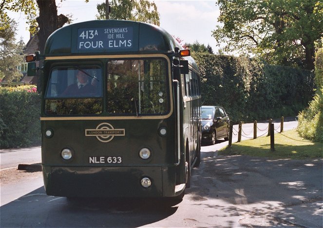 We had a lttle trouble with the front blind, so out came the ladder and the key, the box was opened and the errant tape holding the blinds together was refreshed. Then we reboarded, and turned round the roundabout where the erstwhile 413 route to Brasted turned north. Following the 413A we returned to the main road, and turned right at the triangular junction to drop down off the sandstone ridge into the Weald. We passed Scollops Road, where one service used to turn short of Four Elms while the driver took a break, and rumbled on towards Edenbridge, only to stop short at Four Elms as dictated by the London Transport boundary laid down in the 1932 London Transport Act. Most of the passengers alighted, then RF633 rumbled off north from the crossroads to seek the official turning point (some half-mile up the road). It seemed an awfully long time before it came back.