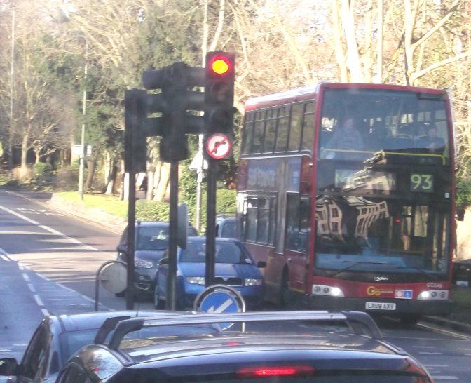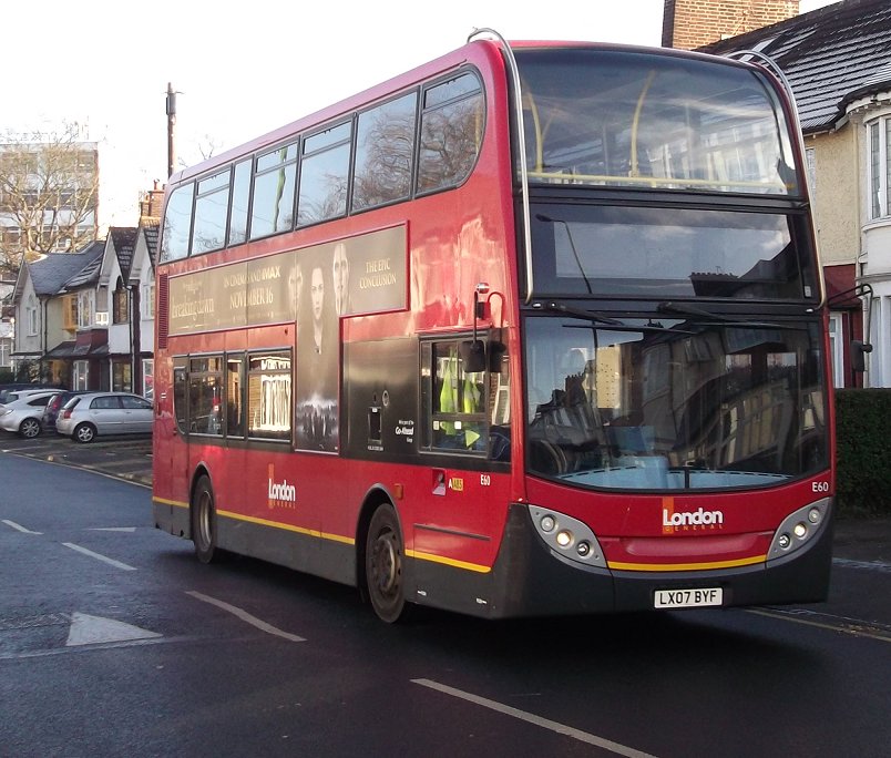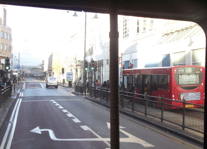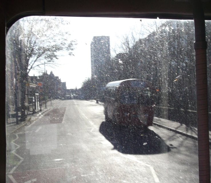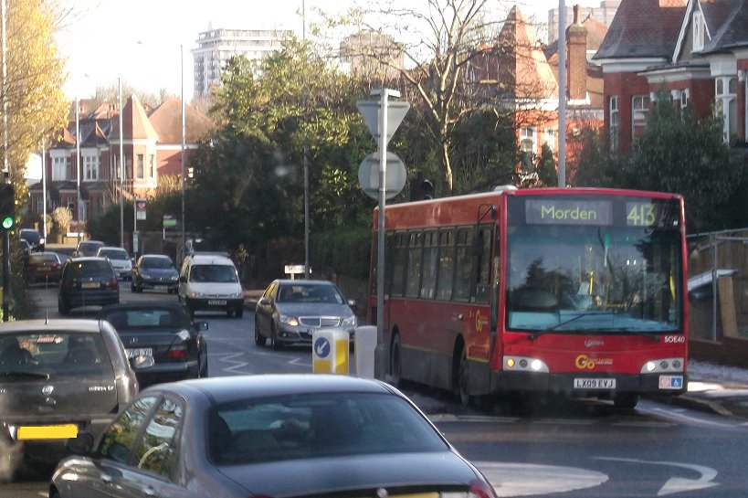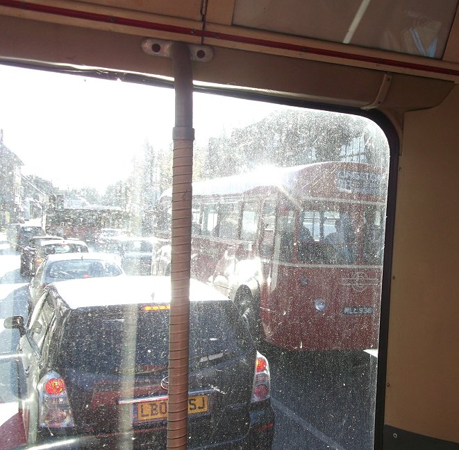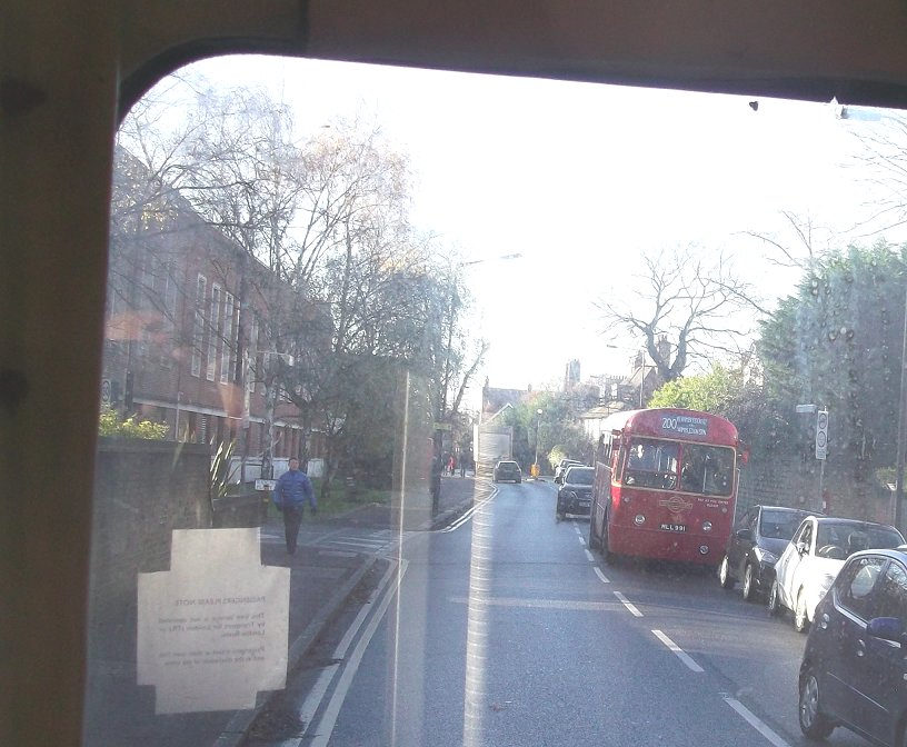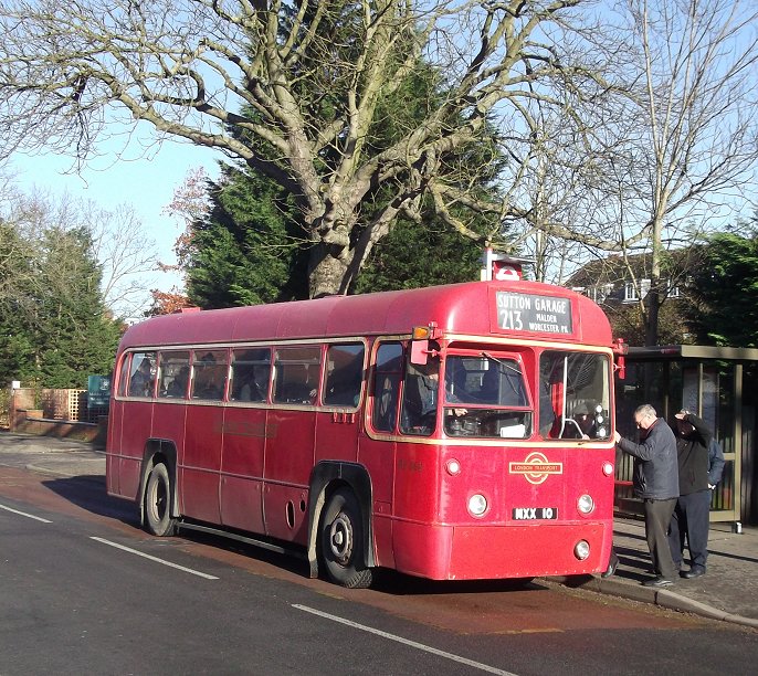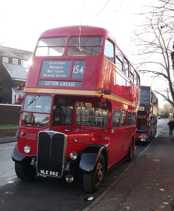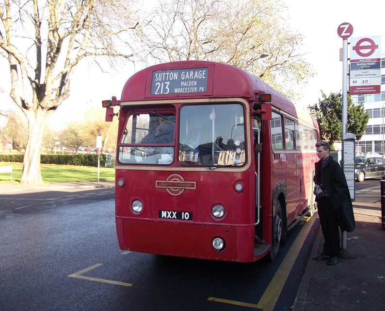 Sixty Years of RFs: 200, 213Sunday 2nd December 2012Prepared by Ian Smith, 8th December 2012.200: Wimbledon Station to West Wimbledon: RF368We rounded the Wimbledon Station loop, with its little bus station. Coming back towards Wimbledon Station we passed EnviroDart SE173 at the island stop I (but I have not been able to work out which route it was on: just what stops at stop I?). We passed the station and set off up Wimbledon Hill, passing another EnviroDart on the 493, and then Optare Olympus-bodied EnviroTrident DOE46 on the 93.Back on the Ridgeway we had to queue for the roadworks again. SE4, back from Raynes Park, squeezed past on the 200 to Mitcham. We escaped, and passed RF354 just joining the eastbound queue. We passed along the Ridgeway, and descended to reach Raynes Park Station, passing more EnviroDarts on the way. Again we looped round past the station and headed west along Coombe Lane. Trident TA233 bowled past on an eastbound 57. We continued along, recrossing the Kingston by-pass, to Trapps Lane, western end of the 200 route, where instead of turning back to Wimbledon we turned south, down to join the 213 route. We stopped at the Langley Grove stop to change the blinds. 213: West Wimbledon to Sutton Garage: RF368Passing through New Malden we met another RF which was heading for Kingston on the 213. No, it was not snowing. Brilliant sunshine turned the windscreen of RF368 into a plane of brilliant salt-spots that my camera's auto-focus just loved! A little further on we passed RF518, likewise heading for Kingston. We continued on through Worcester Park and Cheam, and turned left for Sutton. We turned left along St.Nicholas Way, and worked round to Sutton Green, where we turned in to the terminal stop on Bushey Road. I walked along towards Sutton Garage, and after a few minutes RF368 came past, to disappear into the depths of Sutton Garage at the end of the street. Sutton Garage was quite busy, with buses coming and going. Bright sunshine and deep shadows made photography interesting, especially with an automatic camera. Perhaps I should go back to my manual camera with film. Anyway, Alexander-Dennis bodied EnviroTrident E60 arrived up Bushey Road, and Optare Olympus bodied version DOE24 departed for Kingston on a 213. I looked in through the open front doors of the garage at the line-up. Here were PVL282, E60, SOE36, DOE34 and more PVLs in the front row. Someone told me that there was an RT round the corner, beside the garage. Indeed there was: RT3775, looking excellent back in London Transport red livery, was dressed for route 154. I wandered over to the departure stop, opposite the garage on Bushey Road, wondering what would emerge first.... Photos by Ian Smith. Click on any of them for a larger picture.