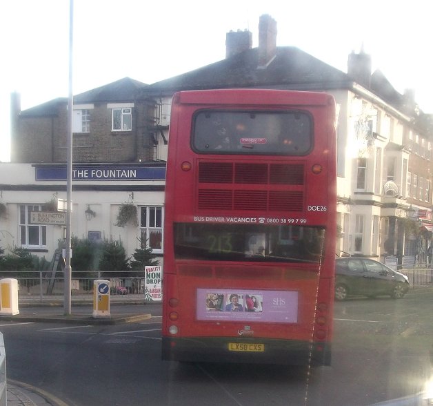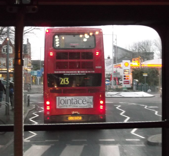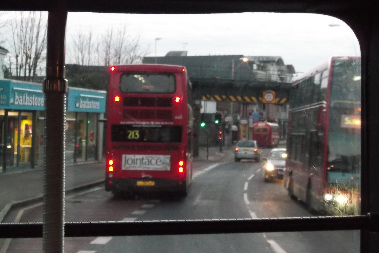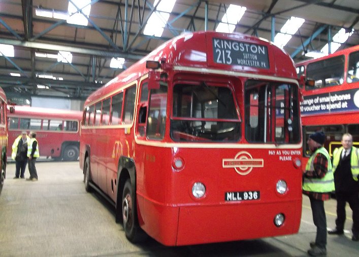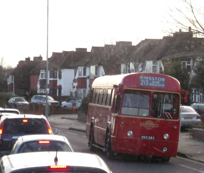 Sixty Years of RFs: 200, 213Sunday 2nd December 2012Prepared by Ian Smith, 8th December 2012.213: Kingston to Sutton Garage: RF486As we set off again we followed DPS584, which was starting a 371 journey down the Thames to Richmond. We called at Cromwell Road Bus Station, then headed east out of Kingston. Climbing up out of the town we met RF326, which ran into a brilliant burst of sunshine just as it passed us.The afternoon was fading, making photography of one moving bus from another moving bus almost impossible. But we did come up behind DOE26 at Malden Fountain. A little further on we passed RF395. We continued on to Sutton, and ran round into the garage. RF468 was tucked in, out of the way.