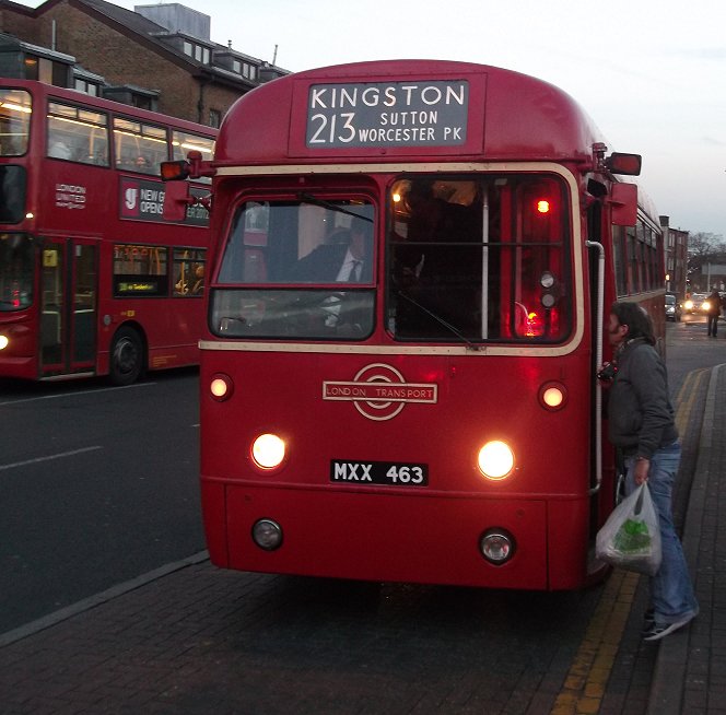213: Sutton Garage to Kingston, RF486We passed various RFs along the way as we ran through the dusk, again with a good complement of passengers. One lady waiting with a pushchair, having seen two RFs go by, complained about the lack of normal low-floor buses. We assured her that the full normal sercvice was running, and one was right behind us.We passed RF395, once again in a photographable location (Odd, isn't it: I never did manage a photo of RF366 today, despite passing it as often as anything else.. The Go-Ahead bus, DOE3, did catch us up, and went past. After all, we were continually stopping to set down passengers. Running down Kingston Hill towards the railway bridge DOE3 was in front of us, with RF518 ahead again, when another DOE came the other way. Four 213s at once! We pulled up at the Fairfield Bus Station stop, RF486 first, then RF518. I gave my thanks to Peter and Steve on RF486 and alighted, and watched the RFs set off round the loop. I passed RF518 again as it waited for traffic lights, and crossed the road before it, so could watch it come round with lights ablaze, heading back to Sutton. I headed for the station, and the train to London. Many thanks to Peter Osborn and Steve Whitelegg for organising the event, and to all the owners, drivers and conductors who made the day such a pleasure. Also to London General at Sutton. Buses: RF319, 326, 354, 366, 368, 395, 486, 518. Photos by Ian Smith. Click on any of them for a larger picture.