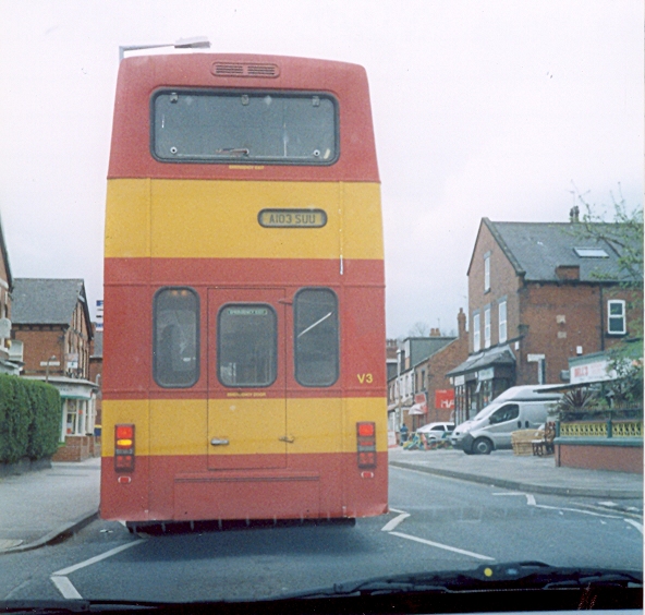 V3 on the 84. This is the reinstated V3, with two doorways, doing short-workings on the 84 on the January 2008 Running Day.V3 was a radically different animal. Although the bodyshell was similar, the second door was located at the rear rather than the centre, and there were two staircases. The idea was to evaluate whether this layout stimulated free flow of passengers at stops, to solve the perennial problem of long dwell times. Unfortunately the twin staircases resulted in a blind spot for the driver, opposite the rear door, so a conductor had to be carried. So V3, which did not get into service until March 1985, eleven months after the other two, was restricted to crew-operated routes. At first it spent most of its time on the 77A, but was later confined to the 88.