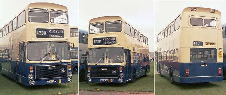 JOV 739P 1976 new to West Midlands PTE: Alexander AV, H44/35F V39 7/87 EW bought by London Buses: into store (Edgware) 7/87 PB transfer, into service (Potters Bar) for 84, 234, 242, 263, 310A and W8 2/88 PB 1989 PB 9/90 PB into store 9/90 sold to Wombwell Diesels by 11/91 bought by Patterson, Kilbirnie 6/94 Patterson & Brown, Kilbirnie JOV 740P 1976 new to West Midlands PTE: Alexander AV, H44/35F V40 10/87 EW bought by London Buses: into store (Edgware) 11/87 HD into service, Harrow Buses for 114, 140, 183, 340 2/88 PB 8/90 PB into store 8/90 bought by Skills Motor Services 8/91 bought by Tame Valley Travel 3/92 to West Midlands Travel 5/92 sold to Doncaster Bus Breakers 3/93 Doncaster Bus Breakers JOV 741P 1976 new to West Midlands PTE: Alexander AV, H44/35F V41 10/87 EW bought by London Buses: into store (Edgware) 11/87 PB into service (Potters Bar) 12/87 HD into service, Harrow Buses for 114, 140, 183, 340.. 12/87 to store at Ensign Bus 1/88 HD ..and out 2/88 HD 7/90 HD withdrawn.. 7/90 FW ..into store (Fulwell) 1/91 sold to Wombwell Diesels 4/91 bought by Taylor's Coaches, Morley 3/93 repainted, reinstated 6/94 Taylor's Coaches 10/94 bought by Abbott's of Leeming 4/01 Martindale, Ferryhill (Co.Durham) JOV 742P 1976 new to West Midlands PTE: Alexander AV, H44/35F V42 8/87 EW bought by London Buses: into store (Edgware) 8/87 PB change store, then service (Potters Bar) for 84, 234, 242, 263, 310A and W8 2/88 PB 1/90 PB into store 5/90 PB ..and out 7/90 PB withdrawn.. 7/90 FW ..into store (Fulwell) 8/90 sold to Wombwell Diesels 12/90 bought by Aaron Travel, Rainhill 12/93 bought by Taylors Coaches, Leeds 6/94 Taylor's Coaches 10/94 bought by Abbott's of Leeming 4/01 Abbotts, Leeming (N.Yorks) JOV 743P 1976 new to West Midlands PTE: Alexander AV, H44/35F V43 10/87 EW bought by London Buses: into store (Edgware) 11/87 HD into service, Harrow Buses for 114, 140, 183, 340 2/88 HD 6/90 HD withdrawn.. 6/90 FW ..into store (Fulwell) 8/90 bought by Jones, Blaenau Ffestiniog 6/94 Express Motors, Bontnewydd JOV 744P 1976 new to West Midlands PTE: Alexander AV, H44/35F V44 9/87 EW bought by London Buses: into store (Edgware) 9/87 HD change store, then service, Harrow Buses for 114, 140, 183, 340 2/88 HD 1989 HD 10/90 HD withdrawn.. 10/90 FW ..into store (Fulwell) 3/91 sold to Wombwell Diesels 5/92 Wombwell: on hire to Kingfisher Buses, Redditch 9/93 bought by Clyde Coast Services, Ardrossan 6/94 Clyde Coast Services JOV 745P 2/76 new to West Midlands PTE: Alexander AV, H44/35F V45 9/87 EW bought by London Buses: into store (Edgware) 9/87 HD change store, then service, Harrow Buses for 114, 140, 183, 340 11/87 HD into store 2/88 HD ..and out 1989 HD 10/90 HD withdrawn.. 10/90 FW ..into store (Fulwell) 9/91 sold to Wombwell Diesels 3/93 still at Wombwell Diesels 3/94 bought by Black Prince, Morley for spares 3/94 reinstated, Black Prince 6/94 Black Prince 7/95 rear end Nova ad. 4/96 with Black Prince JOV 746P 2/76 new to West Midlands PTE: Alexander AV, H44/35F, #4746 V46 9/87 EW bought by London Buses: into store (Edgware) 9/87 HD change store, then service, Harrow Buses for 114, 140, 183, 340 11/87 HD into store 2/88 HD 3/88 EW change store 4/88 HD ..and out 6/90 HD withdrawn.. 6/90 FW ..into store (Fulwell) 8/90 bought by Tameside Travel, Birmingham, Nottingham 10/90 in green/cream (Your Friendly Bus) livery RSF Coaches 1/92 bought by MetroWest, Coseley 7/93 bought by Black Prince, Morley 3/94 loaned to Taylors Coaches, Leeds 6/94 Taylor's Coaches 7/94 in plum/custard 1994 bridge collision: deroofed: fitted with roof from V25 c2/96 on loan to Miramare, Morley by 4/96 sold to Wigley (Carlton) JOV 747P new to West Midlands PTE: Alexander AV, H44/35F V47 8/87 EW bought by London Buses: into store (Edgware) 2/88 PB 10/89 PB into store 2/90 sold to Ensign Bus & Coach, Purfleet 6/90 sold to PVS (Carlton) JOV 748P 2/76 new to West Midlands PTE: Alexander AV, H44/35F V48 9/87 EW bought by London Buses: into store (Edgware) 9/87 HD change store, then service, Harrow Buses for 114, 140, 183, 340 2/88 HD 6/90 HD withdrawn.. 6/90 FW ..into store (Fulwell) 8/90 bought by Black Prince, Morley repainted in plum/custard 6/94 Black Prince PWR 287P reregistered 9/96 sold to Ripley (Carlton) JOV 749P 2/76 new to West Midlands PTE: Alexander AV, H44/35F V49 7/87 EW bought by London Buses: into store (Edgware) 7/87 PB transfer, trainer, then service (Potters Bar) for 84, 234, 242, 263, 310A and W8 9/87 PB into store.. 9/87 EW ..change store 10/87 PB transfer 2/88 PB 8/90 PB into store 12/90 bought by Aaron Travel, Rainhill 12/92 bought by Highland Scottish Omnibuses, Inverness 10/93 bought by Ayrshire Bus Owners (A1 Service) 6/94 McMenemy (Ardrossan): A1 bought by Black Prince, Morley 6/95 used in blue/white AI Service livery 4/96 with Black Prince bought by Darwin & Patrickson, Middleton JOV 750P new to West Midlands PTE: Alexander AV, H44/35F, #4750 V50 10/87 EW bought by London Buses: into store (Edgware) 11/87 HD into service, Harrow Buses for 114, 140, 183, 340 2/88 HD 1988 HD used on 183 1989 HD 11/90 HD withdrawn.. 11/90 FW ..into store (Fulwell) 3/91 sold to Wombwell Diesels by 9/94 bought by CBH Partners, SW1: mobile exhibition unit for Sega Games 9/94 bought by Black Prince, Morley 10/94 sold to Ripley (Carlton) JOV 751P new to West Midlands PTE: Alexander AV, H44/35F V51 12/87 EW bought by London Buses: into store (Edgware) 12/87 HD into service, Harrow Buses for 114, 140, 183, 340 2/88 HD 7/90 HD withdrawn.. 7/90 FW ..into store (Fulwell) 8/90 sold to Wombwell Diesels JOV 752P new to West Midlands PTE: Alexander AV, H44/35F V52 7/87 EW bought by London Buses: into store (Edgware) 7/87 PB transfer, trainer, then service (Potters Bar) for 84, 234, 242, 263, 310A and W8 2/88 PB 7/90 PB withdrawn.. 7/90 FW ..into store (Fulwell) 8/90 bought by McColls Coaches, Bowling 7/92 bought by MacTavish, Dalmuir 3/93 MacTavish 6/94 MacTavish JOV 753P new to West Midlands PTE: Alexander AV, H44/35F V53 11/87 EW bought by 