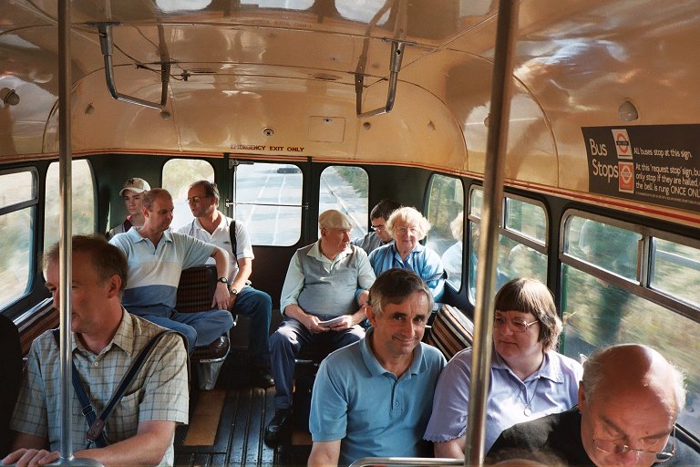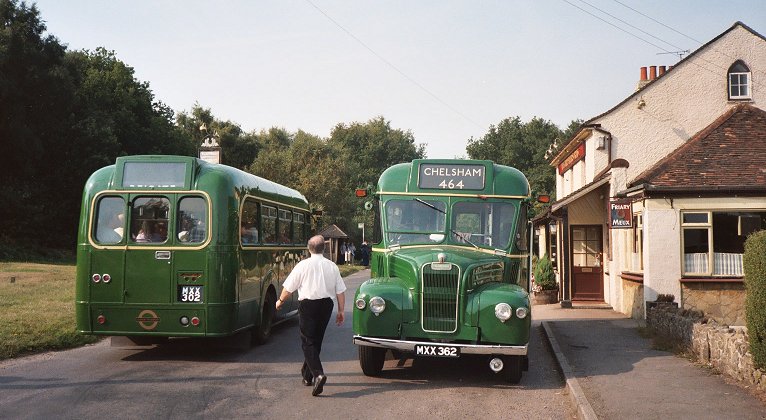 We turned off onto the lane across the Limpsfield Chart golf-course, a route used by the 464 on certain school-runs to avoid the kids having to cross the road. We continued round to Chart, where we met RF633 coming the other way, wearing one of the later 464 blinds (from when the 464 incorporated the 465). Both buses stopped at the Carpenters' Arms, and there was some exchange of passengers.