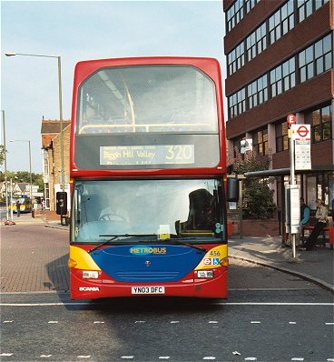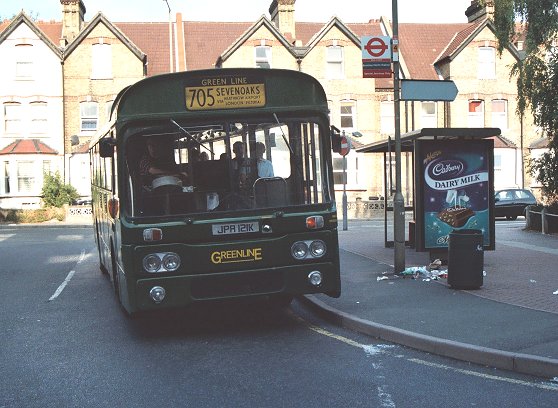 A small green shape came down the road. It wasn't RP21, but a GS. GS12, from the Pump Room, that I hadn't seen before, sedately passed us on its way to Westerham. A few minutes later another green shape WAS RP21. Paul Brophy pulled round to the stop in the deep shadow of the office block, with the RP set up as a Greenline 705 for Sevenoaks, via Westerham.