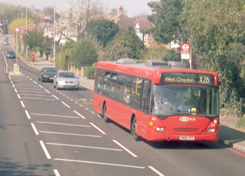 RT3491 came the other way in Beddington, on a 408 heading for West Croydon. We were following one of Arriva's DAF/Wrightbus Cadets on the 410. A modern successor to the Greenline 725, an express on the X26 to West Croydon, came in the shape of Metrobus' OmniCity 541.