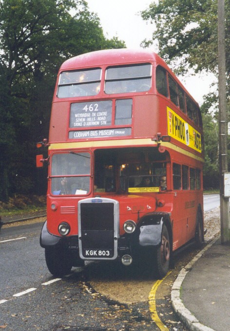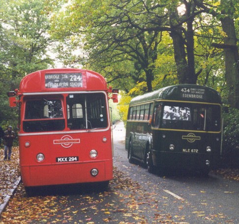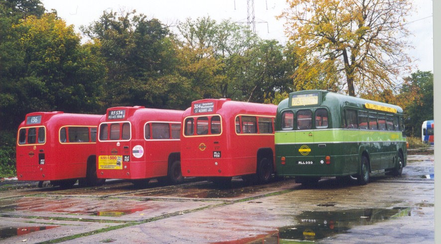 At Cobham I found RF421 ready to depart on a round trip to Ripley and Send, so climbed aboard. More steamy windows, and delightful sounds from the RF engine, as the RF made its way out to the Surrey villages, and back to Cobham. At the museum I passed TD95, and wished I was on that for a 215 trip to Ripley. The rain came crashing down, and I took shelter in the Museum, to inspect the lineup inside and look at the visiting bookstalls. Every now and then I peeked out to see whether the rain had eased. When it did, I ventured out in the yard to take pictures of some of the buses there. The AEC Q, and the Regal siblings T31 and T504 were standing amidst the swirl of autumn leaves.