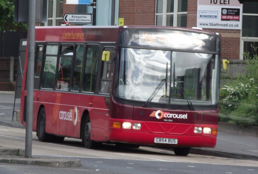 DAF54 heads for High Wycombe, Slough, May 2011.Carousel took over the Chinnor to Princes Risborough rail link in December 2004, and acquired a 9.4m VDL/Wright Cadet to operate it. It was finished in Carousel's attractive red/maroon livery.Not that it remained exclusive to that service. Remaining a singleton of its type with Carousel, it appeared on many of the company's routes, and always seemed smartly turned out.