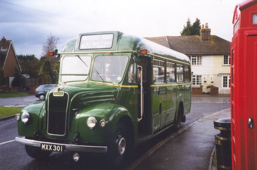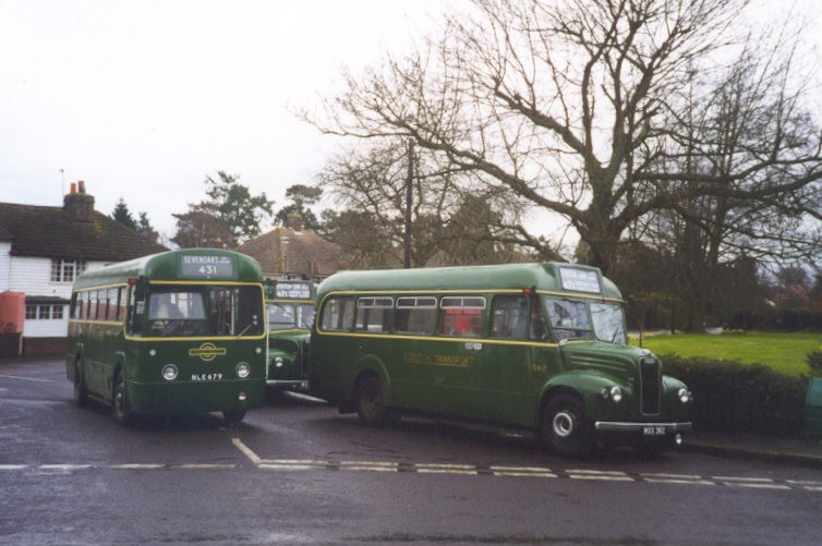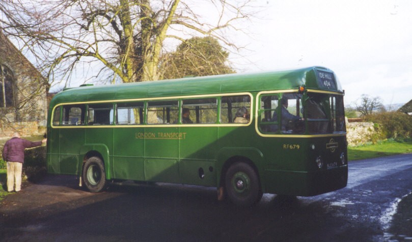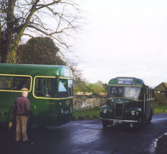 RF679 completed its turn, then the GS demonstrated its more manoeuvrable size as it completed the 3-point evolution. The two buses posed for photos outside the church, and the RF borrowed a set of Chevening blinds temporarily to complete the picture. Then RF 679 set off back to Dunton Green, while GS62, complete with 413A blinds for Four Elms, set off the other way into the Weald on its way back to East Grinstead. Our thanks again to Colin and Alan.