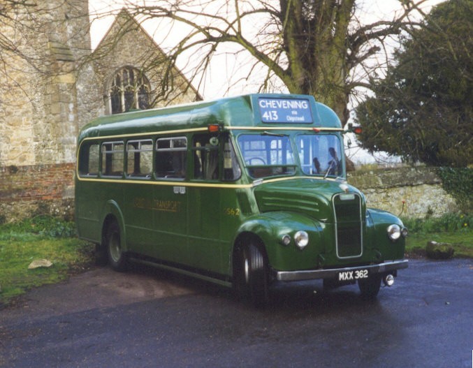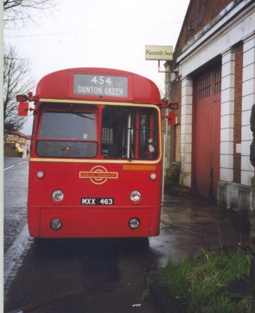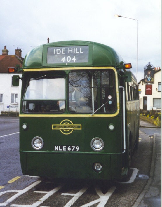 My wife and I had driven down from Middlesbrough that morning, to start a holiday, and met the buses while we were enjoying lunch in the pub at Knockholt Pound. They had already been busy, including a 471 circular tour from Orpington in both directions. The two Guy Specials arrived first, growling up the hill from Pratts Bottom to stop at Knockholt Pound. They waited there in the struggling spring sunshine (after a shower had thoroughly wetted everything), until green RF679 arrived as a 431. The little road junction looked quite crowded with three buses on the stand, and I pondered how often that had happened in the past. (Meanwhile RF486 had gone straight down Polhill to Dunton Green). After we had shared greetings, the buses headed down towards Dunton Green, with me following GS62 on the descent of Star Hill. It reminded me of my youthful cycling days, when trips out from Bromley to Knockholt occasionally afforded a glimpse of a GS: usually heading away from me. The four buses gathered at Dunton Green, in the vicinity of the garage, for further plans and farewells: GS1 and RF486 were heading home from here. After trying out a number of different DG blind settings: 454, 431, 404, 471... RF486 was set with 402 blinds for its return journey up the A21 towards Bromley. Meanwhile Colin Rivers invited my wife and I to go with RF 679 on a trip to Chevening Church via Chipstead and Covney Green. GS62 was to join us at Chevening Church. We went out via Riverhill and Chipstead Village: the daffodils were in full bloom along the way. Once across the M25 and A21 we approached Chevening, but turned west round the estate to reach the terminus at Covney Green: a tiny crossroads that required a right turn into a gateway, reverse across into the farm drive and a further right turn back onto the lane. Covney GreenThen it was back along the little lanes bordering the Chancellor's country residence and up to Chevening Church.One problem here is that the old turning circle beyond the church has been recycled. A three point turn with the RF was still possible however, just outside the church. As the RF was broadside on, GS62 appeared. Have two buses ever been seen simultaneously at Chevening Church before?