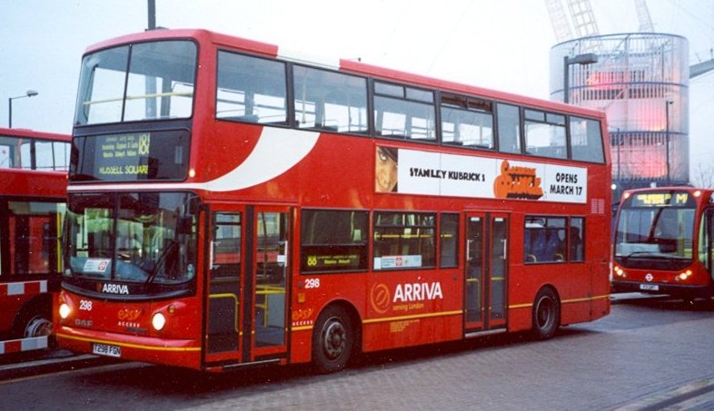 298 (alias DLA98) stands at The Dome (North Greenwich Station) in March 2000.Enfield was the unusual recipient for DLA116-123 in July 1999, unusual in that Enfield was mainly a DLP shed (ie Plaxton Presidents). The last two of these long squat DLAs, 124 and 125, did not come direct to Arriva London. They went as demonstrators (in plain red) to Dublin Bus, where they were DA2 and DA1 respectively, with Irish registrations. They came back to England in June 2000, to Wood Green and reclaimed their original UK plates.