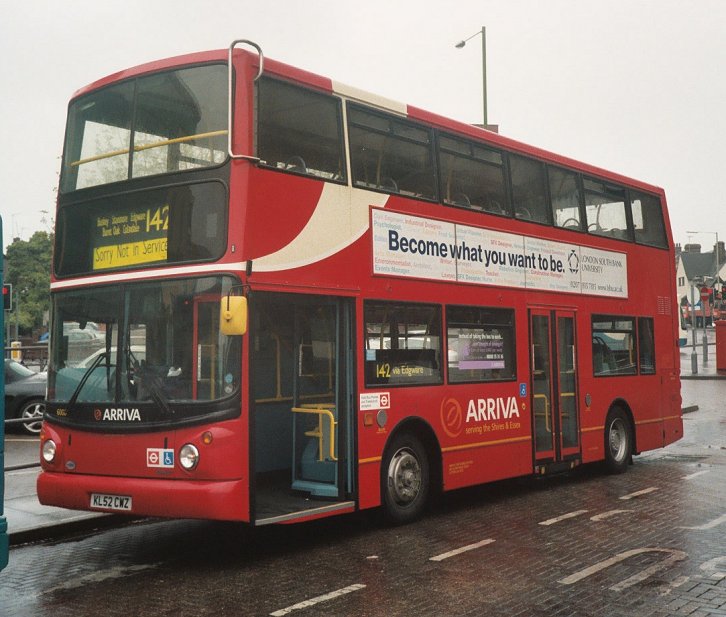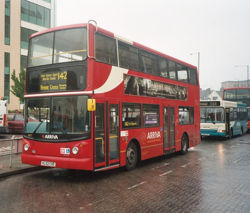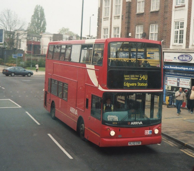 The takeover by Garston of route 258 (Watford Junction - Watford - Bushey Heath - Harrow Weald - Harrow & Wealdstone - Harrow - South Harrow) in February 2006 required new buses. These were Wright-bodied DAF DWs, but the Alexanders were seen on it occasionally. Route 303 (Edgware Stn - Mill Hill Bdy - Colindale), from Garston from September 2006, required single-decker Cadets, but the Alexanders appeared here occasionally too. Then there was school route 640 to South Harrow. 6013 at Watford Junction on a 142 to Brent Cross, April 2004, and 6016 heading north towards Edgware on the 340, the same day.