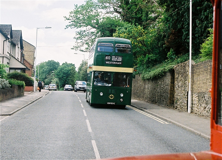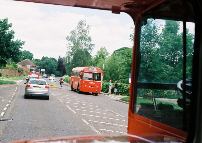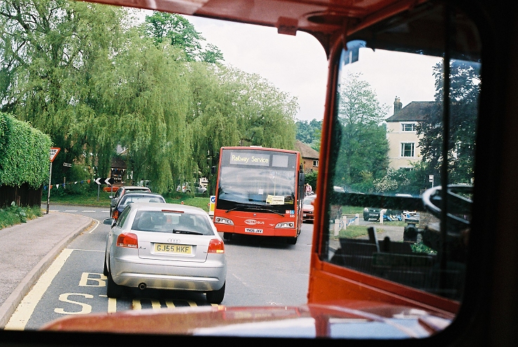 We were immediately away, round the corner to the traffic lights, where we pulled up alongside red RF489, which was heading for Four Elms on the 413A.