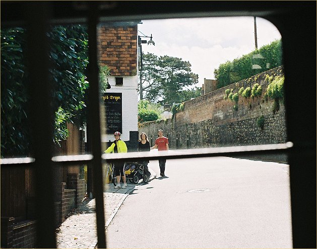 We turned east in the village centre, to cross the railway and climb up towards the big roundabout on the A21. RF315 stalled on the climb. We had to let back down the hill, and try again, this time successfully.