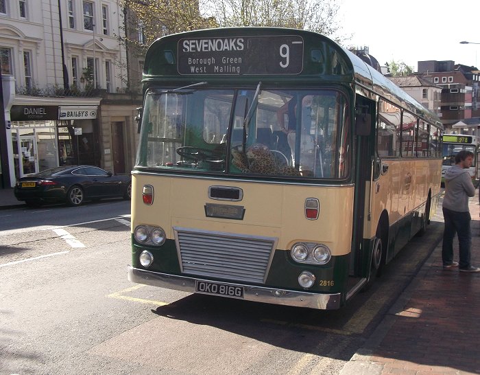 Sevenoaks Running DaySunday May 13th 2012Prepared by Ian Smith, 17th May 2012.705: Tunbridge Wells Stn to Sevenoaks: 2816I reached Tunbridge Wells Station on time at 0915 by Southeastern train. I expected to have to dash up the hill to the War Memorial to catch RT3183 on the 705 to Sevenoaks, but when I emerged from the station I found Maidstone & District Leyland Leopard 2816 waiting at the stop. Not assuming anything, I checked that it was indeed going to Sevenoaks as shown on the front, and that I could join it. The driver expected to meet the timetabled bus there, and was running as an extra.But before I joined the Leopard I went to look at the Countryliner Dart SLF that was at the stop behind, on route 278. DP17, dating from November 1999, has been with Countryliner since August 2003. There was no sign of the RT (it had gone directly to the War Memorial stop, avoiding the station), so at 0935 the blinds were altered to 705, and I boarded the Leopard. By now DP17 had departed, is place taken by DP28. The big coach engine rumbled into life, and with a throaty feline roar we were away, up the steep hill to the War Memorial stop, and onwards. Soon we left Royal Tunbridge Wells behind, and climbed over the hills past High Brooms, before diving down into Tonbridge. We paused at the substitute bus-stop just before Tonbridge Station (which is having a facelift), and changed the blind back from 705 to 9. We crossed the Medway under the ramparts of Tonbridge Castle, and climbed up the long High Street, scene of so many 1960s traffic jams. We forked left past the church, and passed on to Hildenborough. Then briefly we left ribbon development behind as we climbed up towards the Sevenoaks Weald. A big roundabout led us to the foot of RiverHill, and we climbed lustily up onto the hilltop.