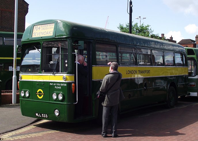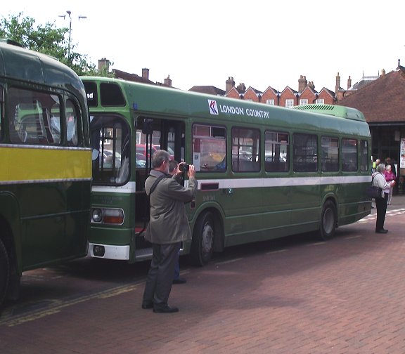 Then there remained just the run-in to Sevenoaks, past Sevenoaks School and the entrance to Knole Park, then forking right to reach the bus station in the middle of town. SevenoaksSevenoaks Bus Station was busy. We had pulled in behind the only regular Sunday service, the 401 between Tonbridge and Chartwell, which was heading south with a Go-Coach Optare Solo. The Leopard was going to provide some turns on route 9 between Sevenoaks and Borough Green.Other buses were arriving thick and fast: RF633 arrived to take up duties on the 413. More RFs had already arrived: red RF406 was set up for the 404, with Shoreham Village blinds even though we could only go as far as Twitton due to narrow roads and parked cars. RF146 had no such worries on Green Line 704 turns between Sevenoaks and Tunbridge Wells. Close behind RF146 was parked another London Country vehicle: Leyland National SNB340. RMC1500 (alias RMC1486) was also in London Country green and canary livery, and would share the 704 duties. RT3183 had arrived before us from Tunbridge Wells, and was already set up for operations on the 403 to Westerham. RF600 and RT604 had both arrived on the 403, RF600 having come from Redhill, and the RT from West Croydon. Red RF429 also squeezed through the bus station. It was time for breakfast in the excellent bus station cafe, open on this Sunday for our (and their) benefit. Photos by Ian Smith. Click on any of them for a larger picture. Ian's Bus-stop