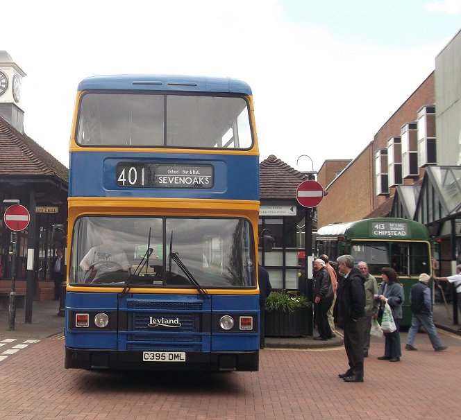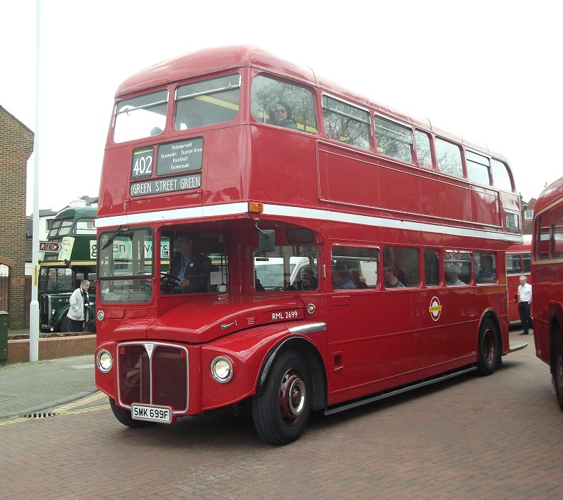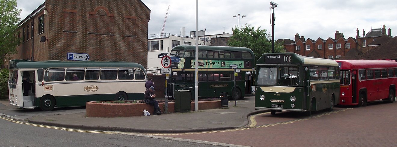 Sevenoaks Running DaySunday May 13th 2012Prepared by Ian Smith, 21st May 2012.Lunchtime at SevenoaksThings were fairly quiet at Sevenoaks when I got back. Many buses were out on various routes, and a few were having a mid-day break. Among the latter were Reliance SC390, Albion Nimbus SO308 and RT3148, while RF406 was still awaiting the puncture repair man.Leyland National SNB340 was set up ready for a 431 trip to Knockholt. But RT604 loaded up for the hourly 403 journey to Westerham, and set off. DMS1868 unloaded after a trip on the 401, then drove part-way round the block to find a parking place. RF429 came in off the 404 from Twitton via Otford, and stopped for a break. "Modernised" RF146 came in off a 704 from Tunbridge Wells, and also parked up. Metrobus Olympian 395 also arrived on a 401 working. GS15 came in off the 413B and tucked away in the Sainsbury's carpark for a short while. The GS was next to go out on the 471 in company with RF429, which had had 471 blinds wound up - actually an unusual "Scotts Lodge" destination. I was given the task of "minding" RF429 for a while, and was standing by it when DMS1868 passed again, this time carrying passengers on a trip to Farningham. Shining RML2699 also left with a good load on a northbound 402. Then we heard that RF429 would have to go out to collect a bus-load of passengers following a bus failure. So GS15, carrying just eight passengers, would be running the 471 to Green Street Green alone. A navigator was needed, so I volunteered, of course, and moved across to the Guy Special..