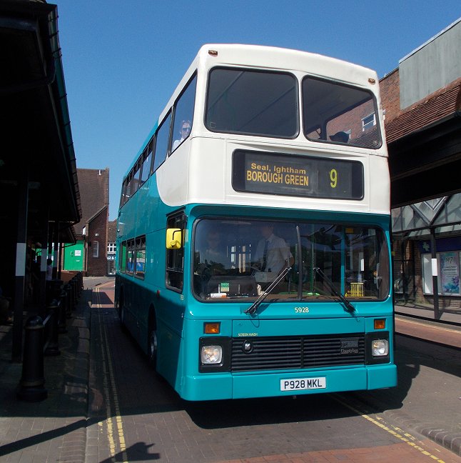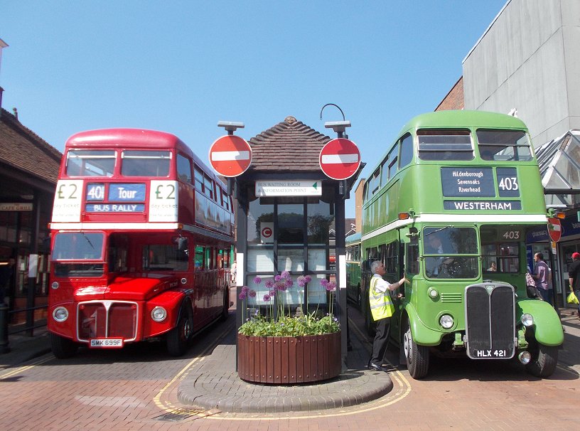 Sevenoaks Running DaySunday May 18th 2014Prepared by Ian Smith, 27th May 2014.Sevenoaks Bus StationI had a quick look round the bus station before going for breakfast. It was busy. The spring sunshine had brought out lots of people. Modernised Green Line RF28 was loading for a 704 trip to Farnborough and back, amidst an interested crowd.Round the corner, in what is usually a car-park, the trade stalls appeared to be doing good business, and RF633 was getting ready for a 404 trip to Twitton. Representing the traditional Maidstone & District presence in Sevenoaks, Reliance SC390 arrived and pulled forward to park for a while. Further down the bus-park were modernised RF146 in London Country livery, and RM1397, which would spend the day on the 402 between Tonbridge and Green Street Green. RT604 was having a break after its long feeder journey from West Croydon, before working with the other RTs on the 410 to Westerham. RF633 headed off round the block to the bus station stands for the 404 to Twitton. The road on from Twitton to Shoreham Village, and the turn there, are now too risky at weekends. Newly-restored Atlantean AN53 was here too, and would share the load on the 402, while regular RF679 was resting before a trip to Orpington. A pair of RTs had joined the throng: Central Area RT1798 and Country Area RT3183, the latter just back from an early trip to Westerham. (Presumably I could have joined this if I had been unlucky with MB90). Go-bus RML2699 was lurking behind RT3183, performing today on the 401 as a change from its regular workings on the Sevenoaks Tours. Having seen what was here at this time, I went for an excellent breakfast in the bus station cafe, open especially today for the event. Half-way through a hot coffee I scurried out to observe Olympian 5928, ex Arriva Kent & Sussex, on the stand for the 1105 service 9 to Borough Green. I went down to look at Camden Coaches' Reliance 900SAF. Camden Coaches took over route 55 to Plaxtol from Maidstone & District, and this vehicle would be working it today. Another bus to catch my eye was preserved M&D OR1, a 1946 Regal with 1958 open-top bodywork. This was extremely popular during the day, and was usually seen stretching its springs with full loads. Less unusual was RF600, loading for the 1110 413 to Chipstead. Red RML2699 came round into the bus station to load up for the 1115 401 to Otford, passing RT1798 at the entrance. RT604 was loading for the 1117 403 to Westerham. Preserved Metrobus Olympian 806 was now waiting at the entrance to the bus station for the 1047 410 to Redhill - a revival for the day of the latter-day 410 service along the foot of the Downs. Whilst waiting for my bus - the 1140 431 to Orpington, I noticed the aliums flowering in the bus station....
