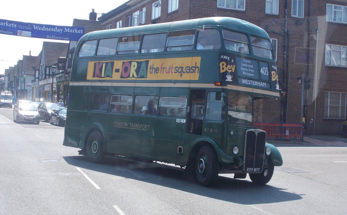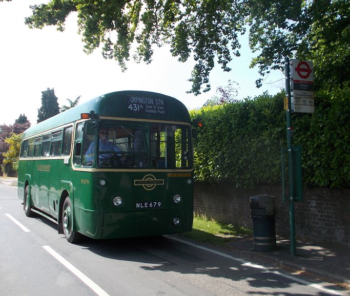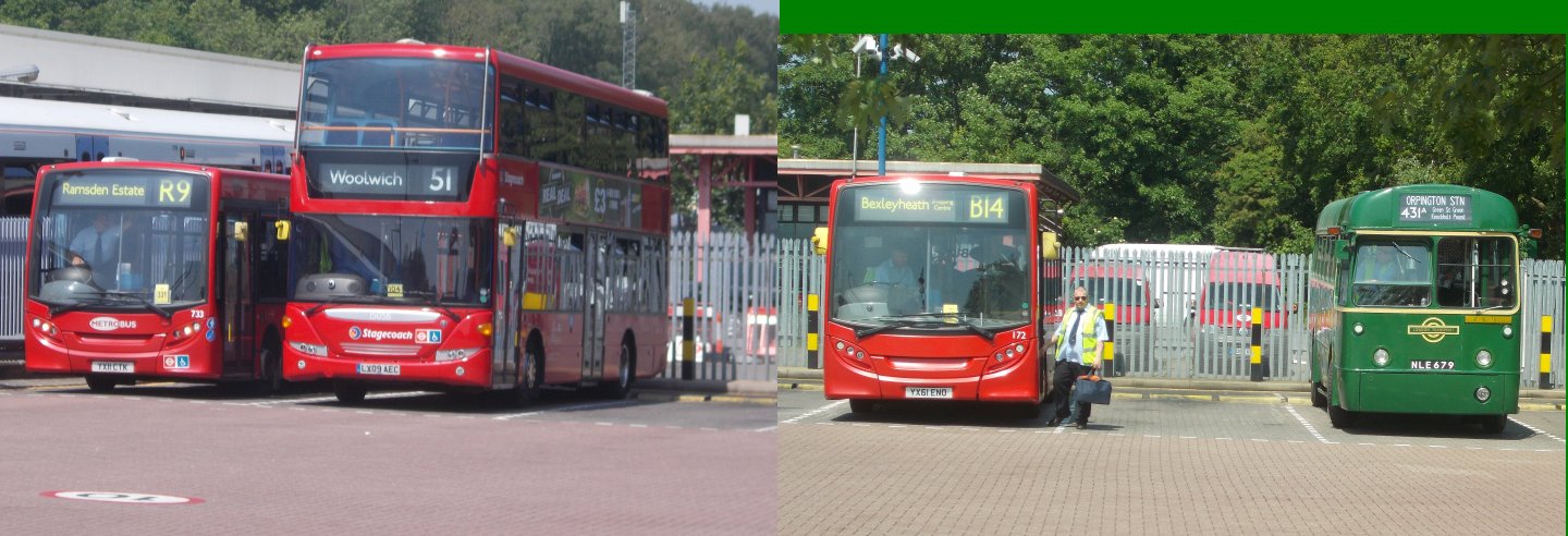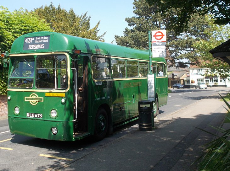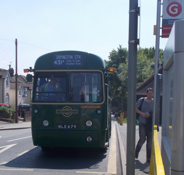 Sevenoaks Running DaySunday May 18th 2014Prepared by Ian Smith, 28th May 2014.431A: Sevenoaks to Orpington Station: RF679I joined Colin Rivers on RF679 and we went round the loop to load in the bus station. RF633 was ahead of us, to load for the 421 to Heaverham. We loaded up, and headed out, passing Maidstone & District Leopard 2816, parked up ready for a turn on the 9.We turned at the traffic lights, and met RT3148 arriving from Westerham on the 403. We headed on past the War Memorial, passing RF28 on the 704. We rolled down through St.John's towards Bat & Ball, meeting MB90 on the 421 making light work of the long hill. WE turned left at Bat & Ball to Riverhead, then north to Dunton Green, and up Star Hill. RF679 made the climb steadily, first directly up the grassy face of the North Downs, then diagonally as the gradient stiffened, then curving up over the top, past the back entrance to Fort Halstead. Then it became a green tunnel up to Knockholt Pound, where we forked left towards the Three Horseshoes. As we approched RF429 poked its nose round the corner on the return working, but stopped on seeing our approach. The two buses met at the Knockholt Pound stop. We rejoined our respective buses (or swapped), and went on our ways. RF679 puttered down through Knockholt, forking right onto the lane to Halstead. We made another photo stop at the TfL bus-stop near The Cock in Halstead. We continued on through Halstead and down to Knockholt Station. As a 431A we continued down onto the main road, and down through Pratts Bottom to the roundabout at Green Street Green. This is still a terminal point, these days for small red buses rather than GS short workings on the 471. Metrobus' 180 was on the stance on an R11, while 183 was just coming up behind on an R1. We headed into Orpington, passing through the road-tunnel under the railway, and turning at the War Memorial to head for the station. Stagecoach EnviroTrident 10184 trundled up the road ahead of us on the 208, but headed straight on under the railway as we turned right up Station Approach to reach the station. TfL rules do not allow us to take passengers onto the bus stance, so we alighted. The RF pulled round the loop onto the stance, and reversed to take up position amongst the waiting buses.