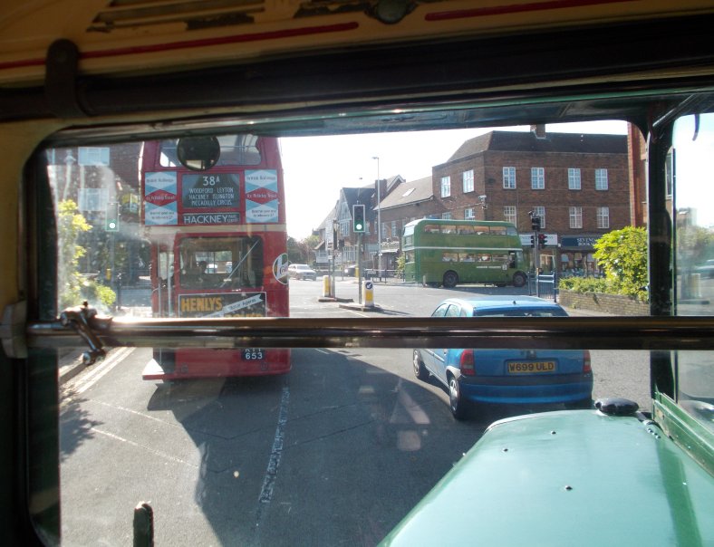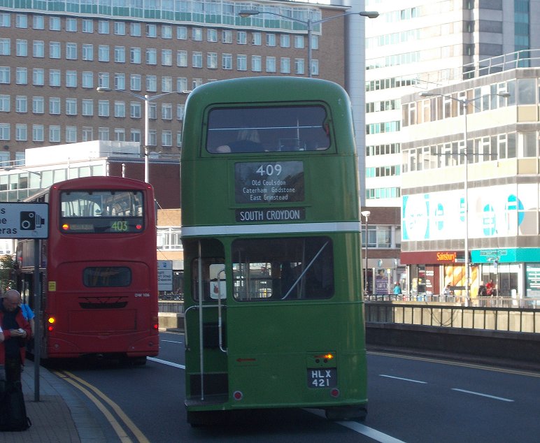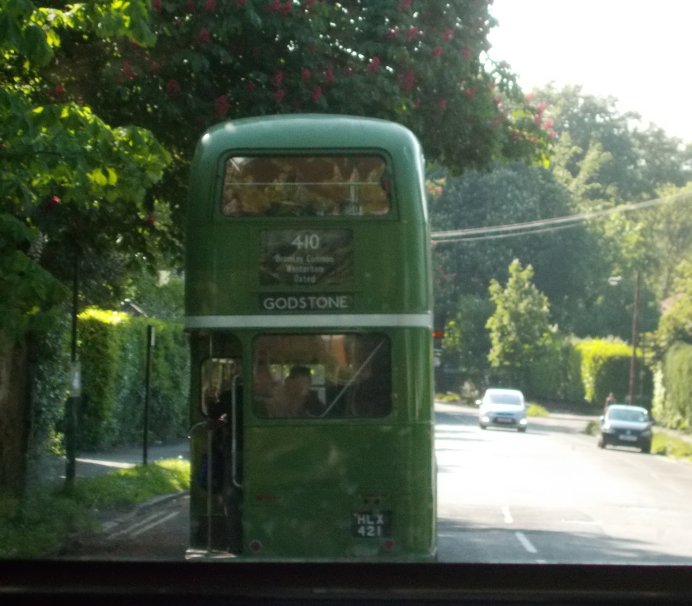 403: Sevenoaks to Croydon (RT3148, DW109, RT604)It was time for the three remaining RTs to depart. I climbed aboard RT3148 for a ride to Chelsham. Ahead of us was RT1798, heading south, and RT604 on a 410 to Godstone. We went round to the traffic lights in convoy, but RT1798 there turned left, while we fopllowed RT604 right. We descended St.Botolph's Road to the station, where RT604 paused to let people off while we sailed past.We motored along at an almost steady thirty mph, over the bump and down to Riverhead, then up through Bessels Green and west through Sundridge and Brasted. We climbed the steep little rise into Westerham. Rather than catch the 246 to Bromley I stayed with the RT, that took the 403 road up Croydon Road, heading for the North Downs, that rose like a green wall ahead of us. RT3148 just romped up the hill, almost reaching the top in third gear, with a change to second needed only for the last twenty yards of the steep section. We cruised along the crest, with great views over the Chart to the south, even for me in a downstairs seat. We met the road from Oxted, and turned north over the bare landscape of the North Downs ridge, then zipped down the gentle gradient to Warlingham Sainsbury's, once Chelsham Garage. The RT emptied, then went off to to Warlingham Green for some late shopping. There was a 403 for Croydon due. Indeed, DW109 was already on the terminal stop outside Sainsburys. Quite a few minutes later it started up, and came round to pick us up. We climbed aboard, taking seats up at the front upstairs. We pottered along to Warlingham Green, where we glimpsed RT3148, then on northwards to Hamsey Green. RF600 came past us, heading for Purley. We descended towards South Croydon, weaving a complicated path between the railway lines and under the right bridges, to reach the Red Deer in South Croydon. There the driver terminated the service, as water was poring from the engine compartment. (Transfer tickets WERE offered). But as we waited for the next northbound bus we saw a 60 coming, so moved up to the next stop for it. But what came round the stricken DW109 was RT604! We flagged it down and squeezed aboard for the short journey into Croydon. The journey terminated at the Fairfield Halls. We alighted, and watched the RT pull away, then turn left to loop back to Purley. Thanks for the ride, fellas. I turned back to the bus stop, and found that my 119 to Bromley was imminent. Service!