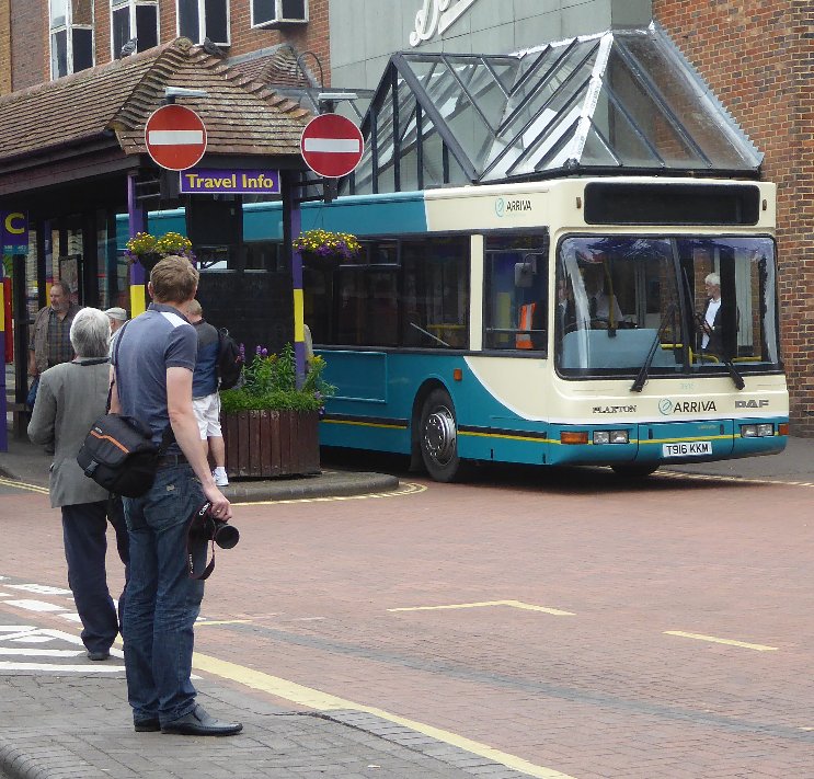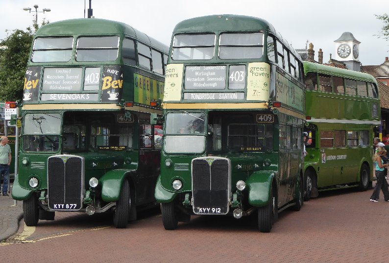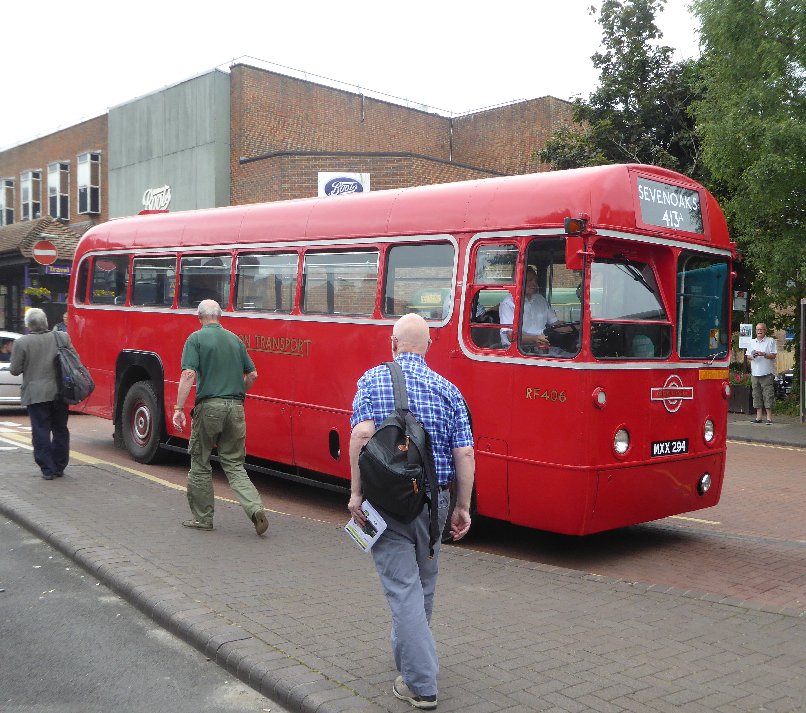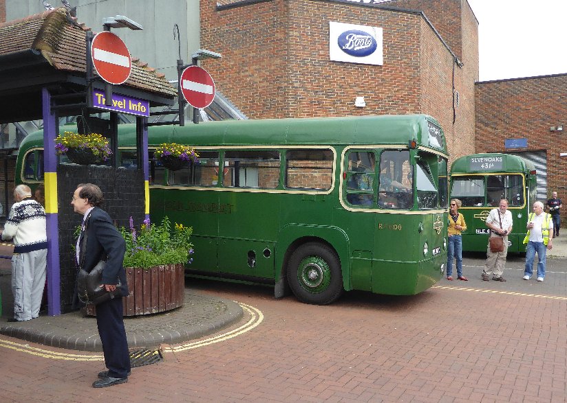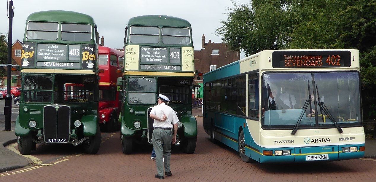 Sevenoaks Running DaySunday 16th July 2017Prepared by Ian Smith, 21st July 2017.Part Two: SevenoaksAlready arrived at Sevenoaks bus station was a pair of Country Area RTs, that fortuitously were parked next to each other - an inspiring sight. A Go-Bus Solo in silver livery squeezed past, presumably on a 401 to Westerham, followed by an Arriva-liveried DAF "blinded" for a 402 to Sevenoaks. I thought that this was a sight not long to be seen, as from 23rd July Arriva was to truncate the Bromley 402 service at Dunton Green. I wondered why it was a DAF rather than the regular Optare Versa. Then I realised that this is a preserved bus, here for the running day, having run in on a feeder from Tonbridge or Tunbridge Wells.RT604 arrived from Croydon. I had hoped that it would pull past the other two, giving a triple line-up, but it was pulled in behind RT3183. A pair of RFs had arrived, both long-term CBR attenders. RF633 has recently changed owner, but was still here, dressed for the Green Line 705. RF679 is still with the team, and was tucking in behind RF429.