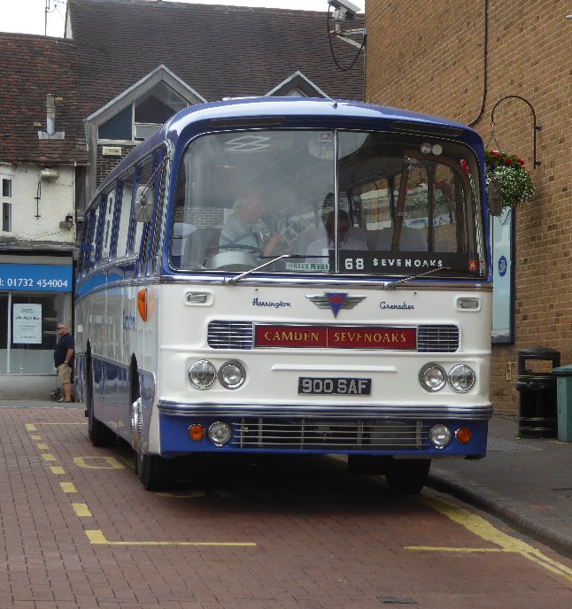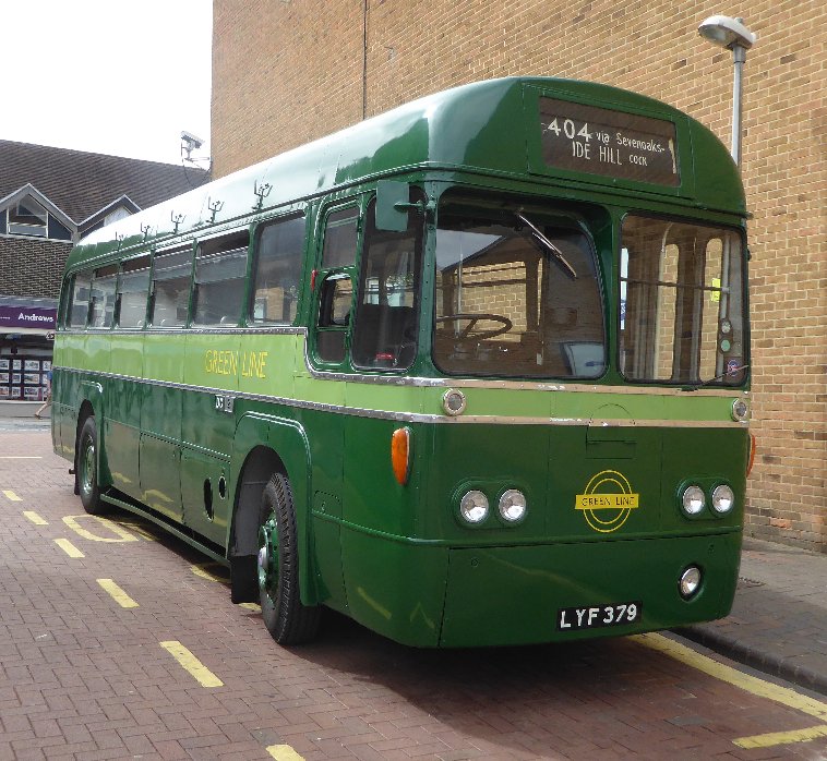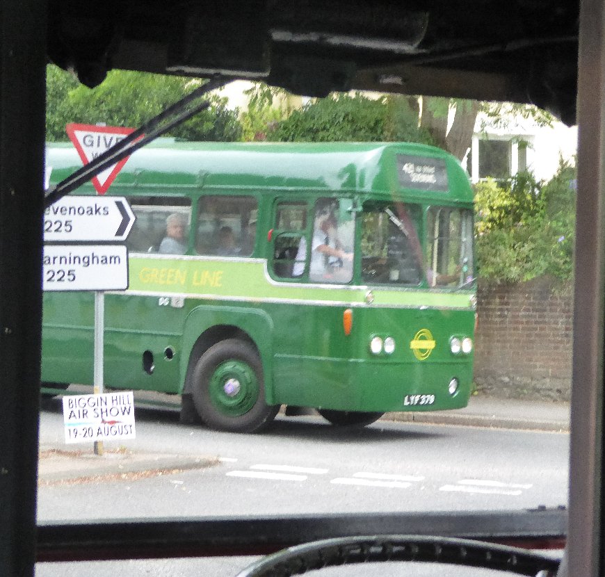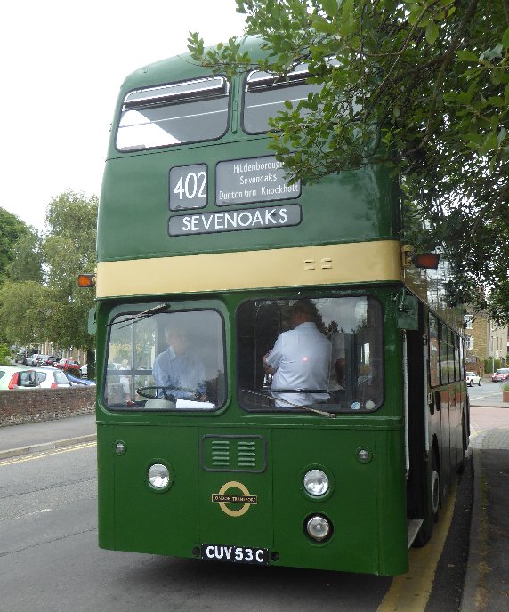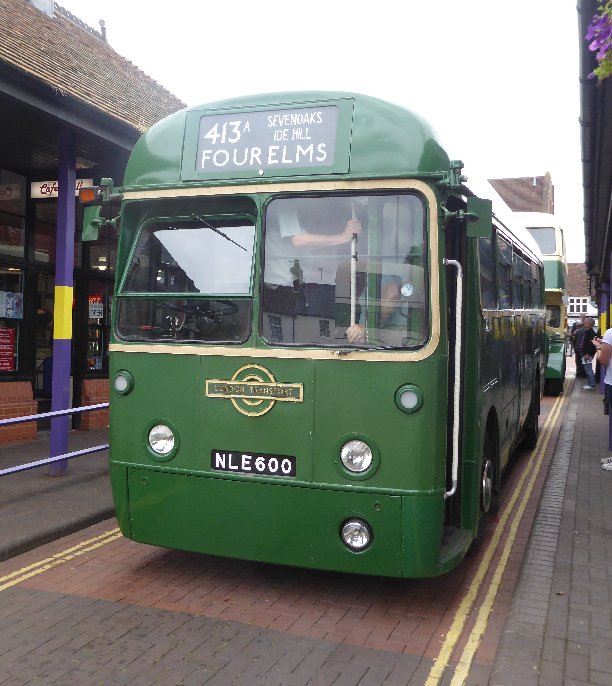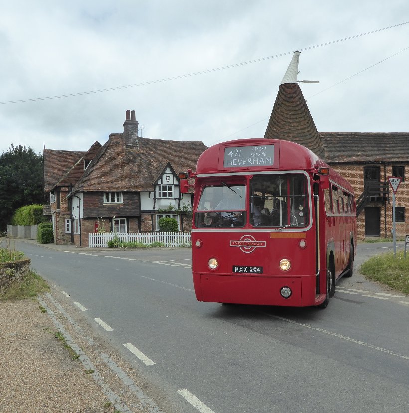 Sevenoaks Running DaySunday 16th July 2017Prepared by Ian Smith, 28th July 2017.Part Five: 421 to HeverhamBack at the bus station I got a better look at two buses that today I had only seen in passing: RF600 on the 413A, and Camden Coaches 900SAF off the 68.Down in the bus park stood Jersey 24 and Daimler Fleetline XF3 off the 402. 421: Sevenoaks to Heaverham: RF406Time for another ride. There was RF406, loading for the 421, a route I had not visited for a few years. So I hopped aboard.We set off, round the block, and right at the lights. Coming the other way was the East Kent Regent V, GJG739D, in Sealink livery. It was returning from a tour down the Darenth Valley, probably to Farningham. We rolled along past the War Memorial, and down to Bat & Ball, where we went straight on towards Otford. We rounded the Pond, and met RF48 coming the other way. We climbed up past the railway station and turned onto the Pilgrims Way. Narrow. The trees too not only overhang the road, but form a tube. So progress, against on-coming car traffic, was slow. The 421 came this way, instead of the more obvious route through Seal, because of the 1933 London Transport Act. Seal was outwith the LT boundary. The Heaverham service then (via Seal) was worked by Sevenoaks & District using diminutive 14-seater Dennises. That concern was taken over by LT in 1939. Two Dennises were used temporarily, then the 421 (via Otford) was progressively upseated to Cubs, then Regals, then RTs, as wartime traffic blossomed. It is hard to believe today that RTs operated along here! Eventually the Pilgrims Way narrowed again, to a narrow lane, and we turned down into Kemsing. We turned left to the village centre, and continued on to reach the cluster of dwellings at Heaverham (Heverham to LT). There RF406 did a reverse turn in the T-junction. This, with no street lighting, must have been fun in the dark, especially in opo days.