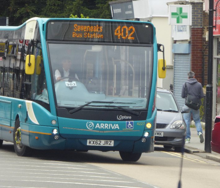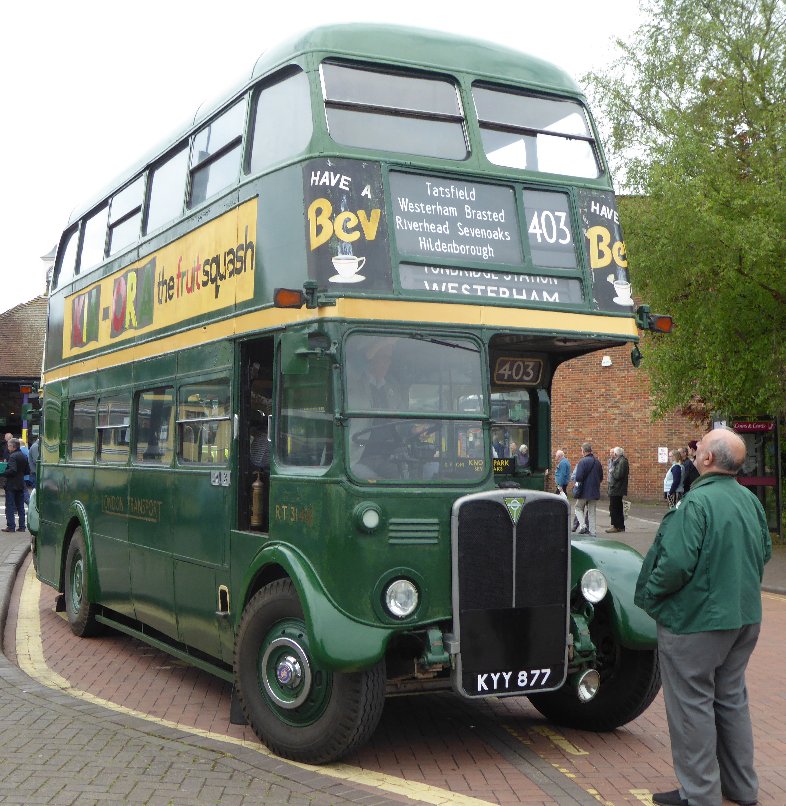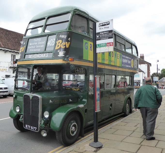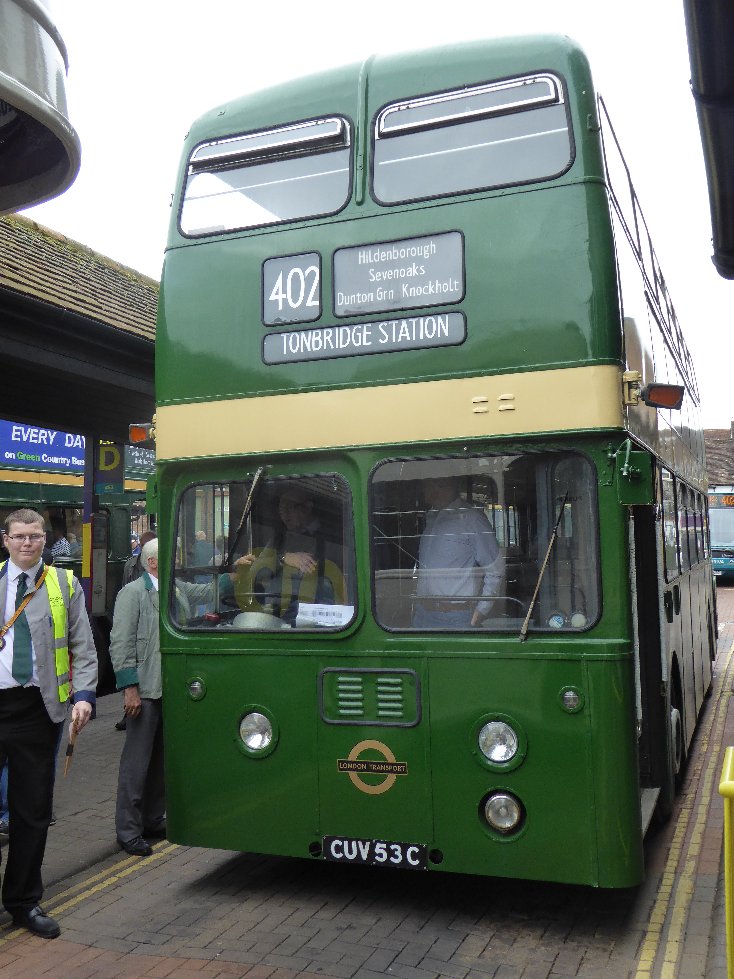 RT3148: 403: Tonbridge - WesterhamWe had a substantial layover at Tonbridge Station: John is good at travelling fast without stretching the speed limits, and RT3148 is a goer. It was long enough for Arriva 3523, that we had seen at Sevenoaks, to catch up.We set off northwards, very soon meeting Streetlite 1657 in eco-green livery on a 218 to Tunbridge Wells Hospital. We climbed up through the town, and forked left towards Hildenborough. We met RF28 rolling into Tonbridge on a GreenLine 704 working. We climbed gently up through Hildenborough, meeting southbound RT604, looking good in its spring green livery. Then it was round the big roundabout at the foot of River Hill, and the long slow grind up the hill. First gear in places. But we reached the top and passed the local short-working terminus of The White Hart for the rumble onwards into town. At the bus station there were several backsides: RF600 was in front of us in our bay, loading for a 421 to Heaverham, and Brighton, Hove & District open-topper CAP229 was in the other, working local tours. There were also fronts on view too: XF3 was on a Tonbridge-bound 402, and RT3183 was back from Westerham on the 403, also bound for Tonbridge Station. But we could not stay long: we were on a through working to Westerham. So we rejoined RT3148 for the onward journey... We headed north to the War Memorial, then down St Botolphs Road to Sevenoaks Station. We went on over the bumps towards Riverhead. RT1798 caught me by surprise, so I only managed to grab a photo of half of it! But I was ready for RF271 on a Sevenoaks-bound 705 as we approached Riverhead. We turned left onto the A25, and climbed gently up through Bessells Green. We rolled alongside the M25/A21 junction briefly, then continued westwards through Sundridge and Brasted. The huge chestnut tree in Brasted was at its spring best. It did not take long before we reached the Edenbridge turn-off at the foot of Westerham. We turned uphill past the Green, with its statures of Wolfe and Churchill, to terminate outside The Kings Arms.