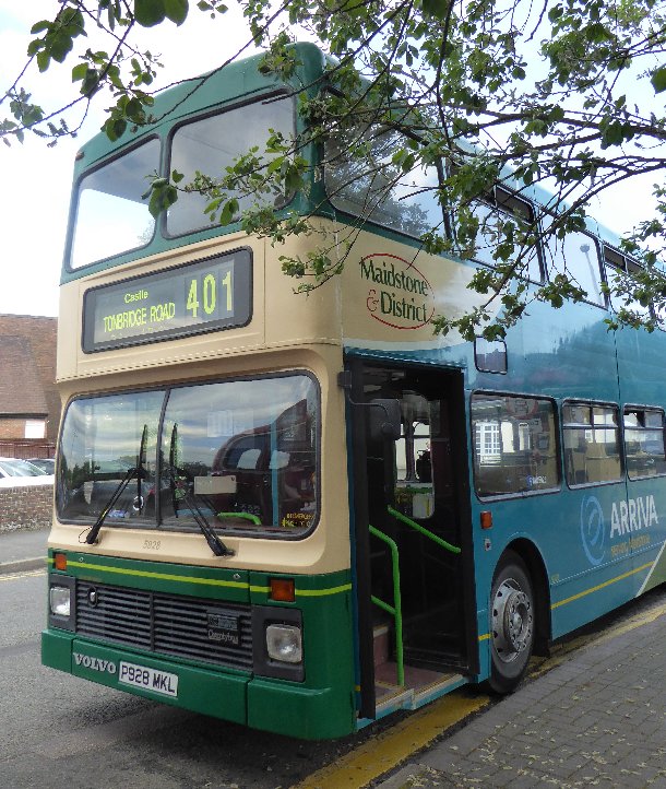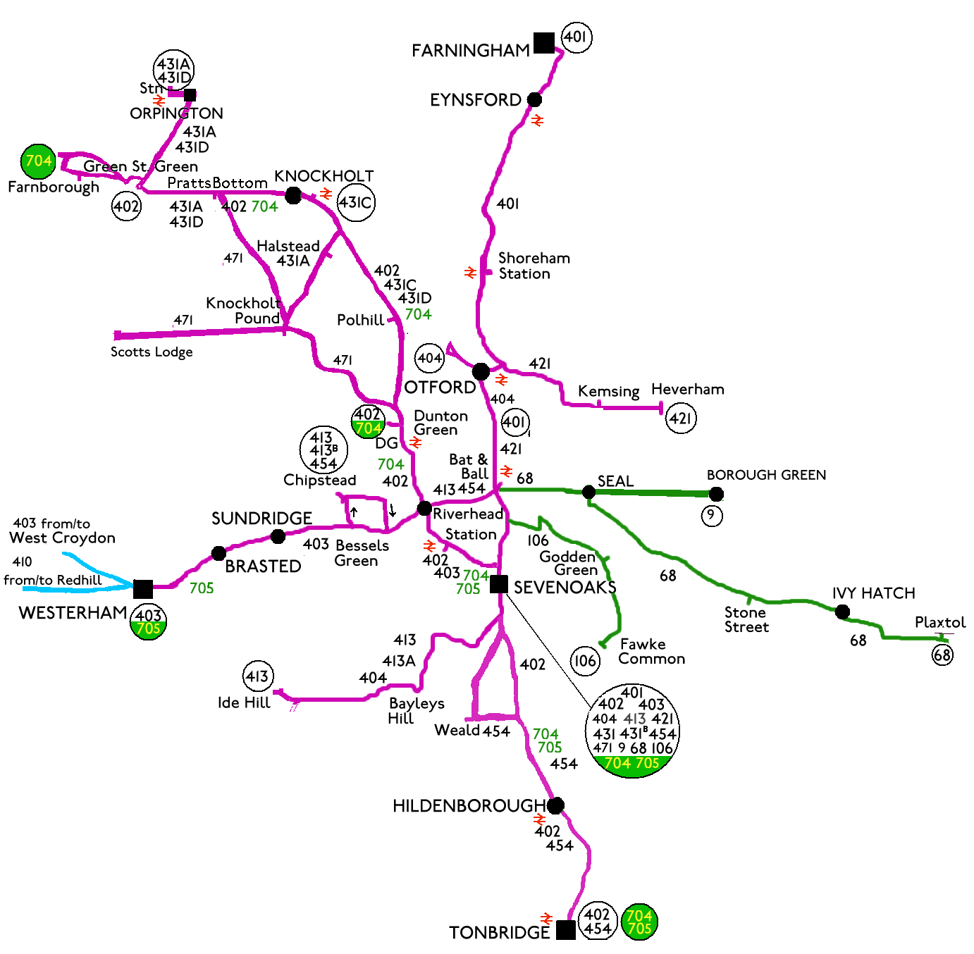 Sevenoaks Running DaySunday May 13th 2018Prepared by Ian Smith, 21st May 2018.Part 6: A Garage run and a home run402: Sevenoaks to Dunton Green - and back: RM1397RM1397 came round onto the stand, wearing blinds for route 61. Quite appropriate really, as this was one of the closest RM routes to today's running day, touching its area at Orpington Station. (The 51 got closer, terminating at Green Street Green, but why spoil a good story?) I have called this a 402 trip, as Country Area practice was to label garage runs with the lowest route number serving that route.Anyway, enough burbling. I climbed aboard, and sat downstairs near the front nearside window, behind the bonnet. We set off by the now-familar route, along to the War Memorial, down St Botolphs Road to Sevenoaks Station and over the bumps to Riverhead. The seat was comfortable. The big Leyland engine rumbled very quietly. I nearly went to sleep. I would have been very happy if the bus was indeed going to Bromley South. But we rumbled up into Dunton Green, over the last remaining bridge on the Westerham Branch and the site of Dunton Green garage. Not even a bus stop now. We continued up through the village, and just before the motorway bridge met RF271 heading south on the 704. We turned at the roundabout at the foot of Star Hill and rolled back down through the village to The Duke's Head - the bus stop opposite the old garage site. After a pause we set off back into Sevenoaks, to terminate at the Bus Station. RT604 had arrived just before, having been to Chipstead and back as a 454. Another arrival was the M&D Dart 3238, back from Borough Green. Around the corner stood another two buses that I had seen only fleetingly during the day: M&D Olympian 5928, that had been working the 401 to and from Farningham, and RF406, which had been on several routes, including the 421 to Heaverham.