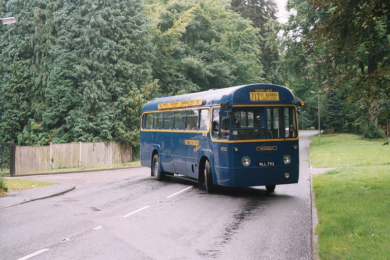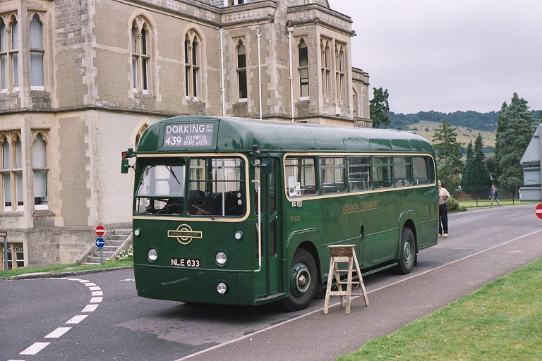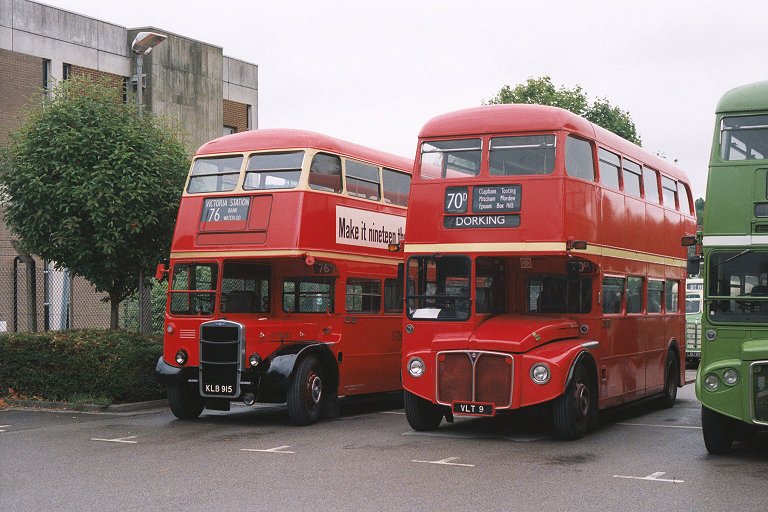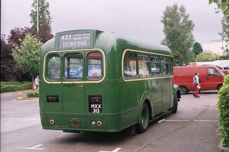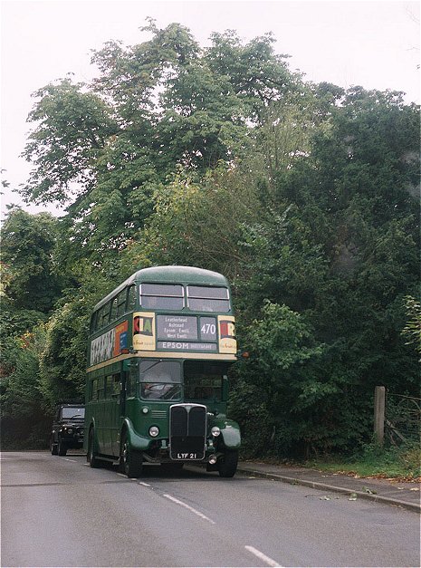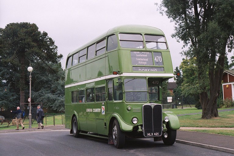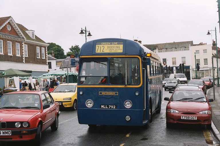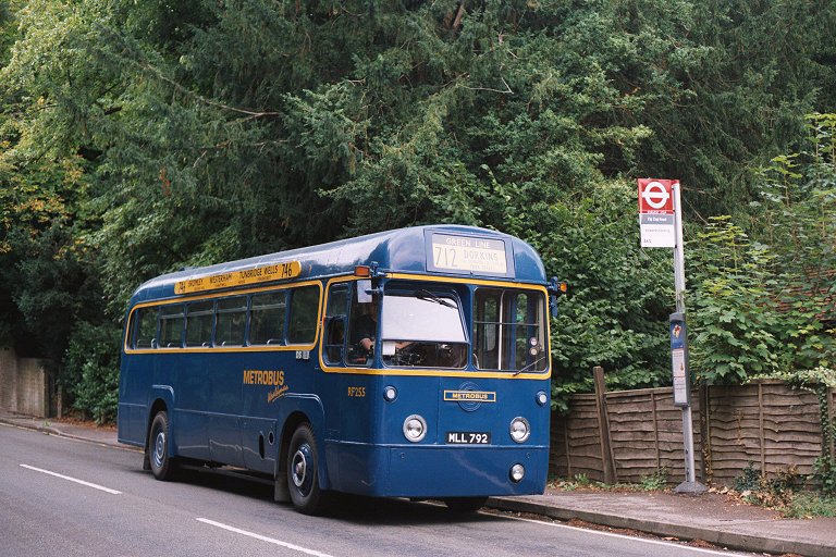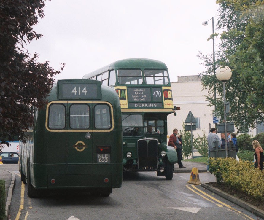 712 to Epsom and backWe set the blinds on RF255 for the 11.15 712 run to Epsom, the first of the day. We couldn't find Epsom on the blinds, so we put up St.Albans - of which more anon. Out at the bus stop there was a massive queue - but not for us apparently. A handful of passengers joined us, but we weren't a GS or a double-decker... It began to rain as we headed north through the Mole Gap under the flank of Box Hill. We pulled off the main road at Burford Bridge, to take the traditional quiet route to Mickleham. Very pleasant. Trees all round, lovely scenery, a quiet road. GreenLine time-warp. But soon we were back on the main road for a stretch towards Leatherhead. We turned off into the town, and began to experience the joys of the Leatherhead traffic system.RF255 turns near Leatherhead, on diversionThen in Leatherhead a lady flagged us down. She had seen the St Albans on the front. Was this a new service? She had a sister in St Albans. It seems that the RF still looks like ordinary bus to the person in the street! We told her what was happening - to her disappointment - and wended our way through the narrow main street. But at the roundabout where we should have turned to skirt alongside the railway the quarter-mile to the station we found barriers and diversion signs. Aaargh! We went straight on, briefly, while we thought about it. But the Guildford road was not going to get us to Epsom. Shortly we found somewhere to turn, and headed back into Leatherhead. A roundabout before the blockage had diversion signs, so we followed them, unsure whether we could get back through the town. The diversion took us along the 462 route towards Stoke d'Abernon. Hmmm, I thought, 462 was single-deck for a reason. Sure enough, after a mile there was a 12ft 6in railway bridge. O.K. for us, but we hoped no double-deckers followed us! Three miles along we met the A245. RF213 was coming the other way round the diversion. The official diversion signs pointed us back towards Leatherhead station, nearly three miles along. Well late, we passed Leatherhead station, with its rail replacement buses, and headed for Ashtead and Epsom. We found the terminus near Epsom Clock, but did not have to wait time before the return. With few passengers, none of whom wanted Leatherhead, we decided to skip round the by-pass, so that we could inform control at Dorking. We did take the old road through Mickleham to Burford Bridge. I shaln't tell you the comments when we told the controller at Dorking about the low bridge! Tea-breakIn between turns we had a few minutes to see what was going on. RT 604 had arrived safely back from a trip to Epsom and back as a 470. RF633 had returned from a 439 excursion to Newdigate and back.Over in the bus park things had changed. Leyland National SNB312 had arrived, having REALLY worked through from Luton and St Albans as a 712, an almost 3 hour journey. Next to RMC1476 now stood RM9, which had worked in as a fare-paying service trip for its operator London General, reviving the old 70D service. Today it had worked across South London from New Cross to Morden before heading down the traditional route. Also there was visiting RTW185.