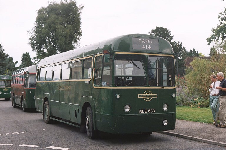 We needed a meal break, and dashed up the High Street for some convenience food, avoiding being mown down by red RF486, setting off on the circular 439 to Newdigate. On the way back we noted that it was now GS32 in the bus park, setting off on the long rural 449 to Ewhurst. RF633 was now ready for a turn on the 414 (Reigate-Dorking-Capel today, West Croydon-Horham on the full journey). The steps used for changing the blind rollers had now moved elsewhere along the line. Mike had gone to fetch RF255, and posed her alongside RF4, which had been on a 714 journey to Chessington and Hook and back. I hopped on, and we went up to the stop. Another 712 to Epsom and back.As we went up the slope to the main road we followed RF633, going off on its 414 working. We squeezed past RT2083, arriving from Epsom on a 470. Again the load was light, but we enjoyed the trip back up through the Mole Gap. At Burford Bridge we saw one of Northdown Motor Service's Metrobuses, M502, replacing a train on the Leatherhead - Dorking service. At Leatherhead we avoided the town centre loop and railway station, and turned towards Epsom. Red RT2043 came the other way on a 93 service. This is the first of the Country Bus Rallies to use a red bus route, (although red RTs have been used frequently on green routes). The 93 was one ofthe weekend red services extended far into the countryside in the days before mass car ownership.Going into Epsom we passed RT604 heading for Dorking once again, then met up with RF213, also on a 712. No wonder that we were lightly loaded. There were other buses there too. London United was present with Volvo Alexander VA15 on the 406, while London General operated low-floor Dart/Plaxton LDP43 on the 293 to Morden Station. Going back, with RF213 in front to cater for the Leatherhead traffic, we took the by-pass again. We met RT2083 again, then paused at the LRT bullseye bus-stop at Boxhill to wait for time (and RF213). Presently RF213 arrived and drew up behind, steaming gently. Eventually we persuaded him to go round, and precede us into Dorking. We arrived back to urgent requests to replace a GS on the 412. The GS had disappeared into the wide green yonder, and there was a good crowd assembling. As we wanted to do the 412 anyway, for nostalgia reasons, we went off to park, take a PNB and change the blinds. Part 3: 412 to Holmbury St MaryAll photos by Ian Smith. Click on most of them for a larger picture. |