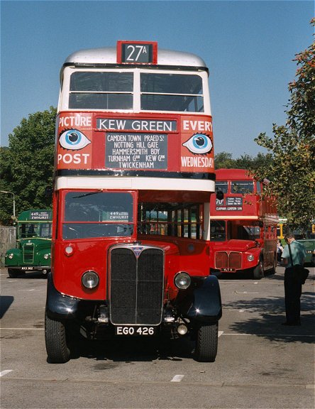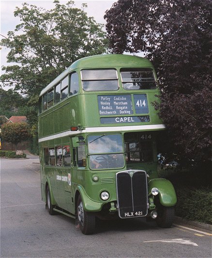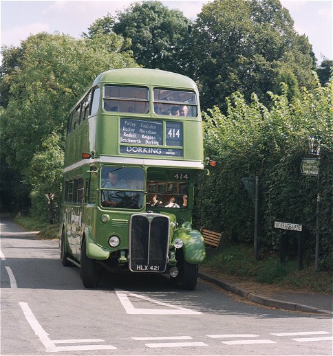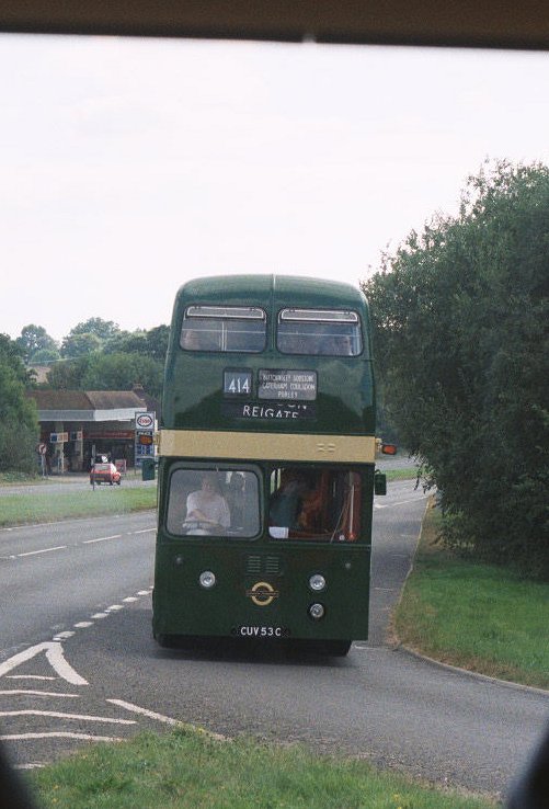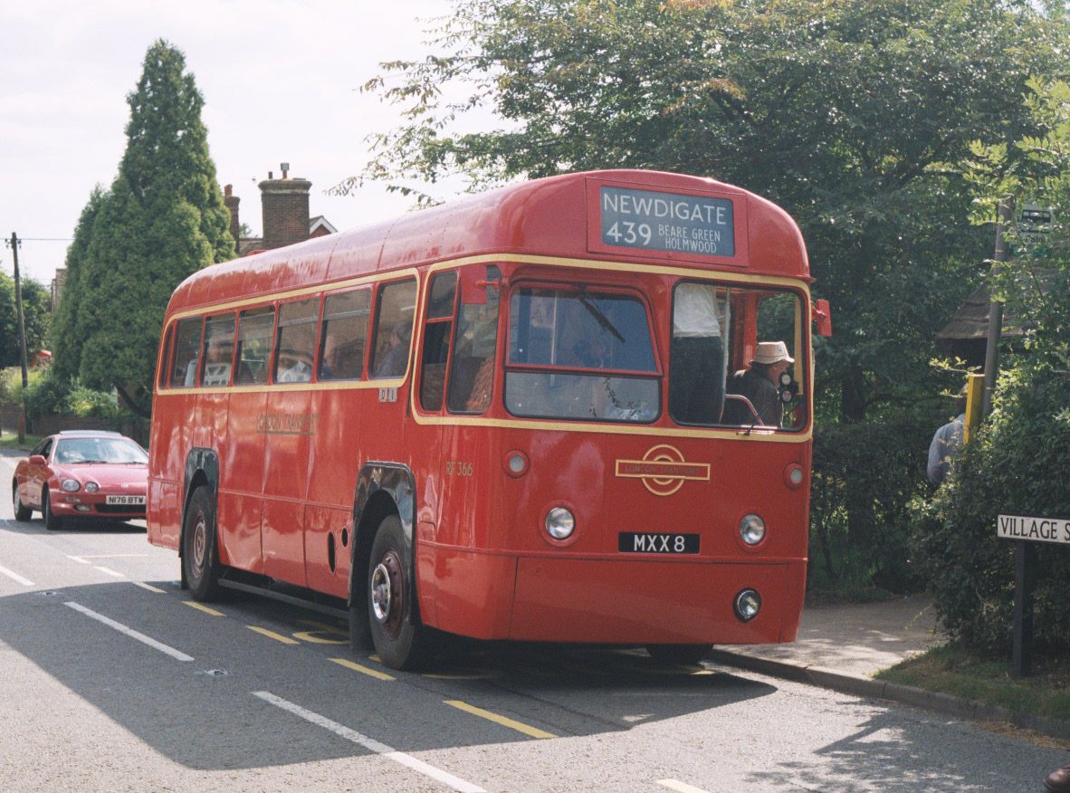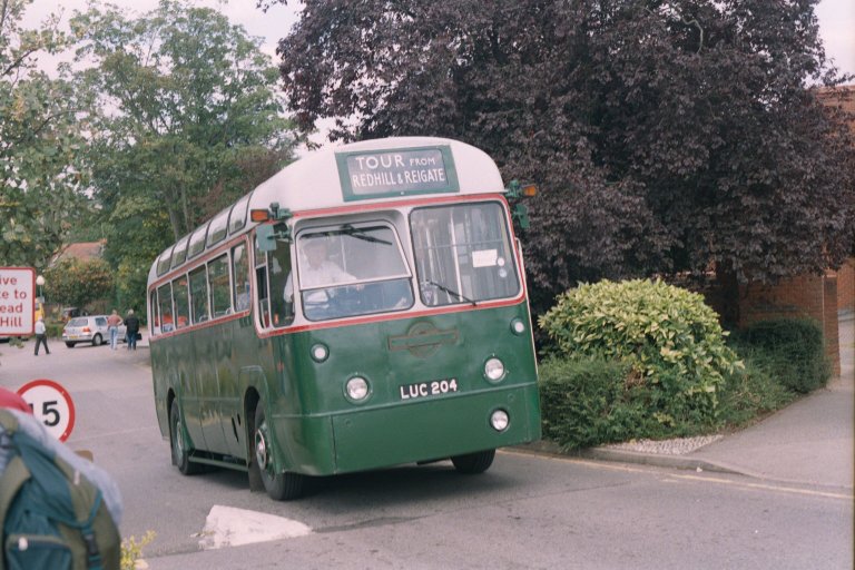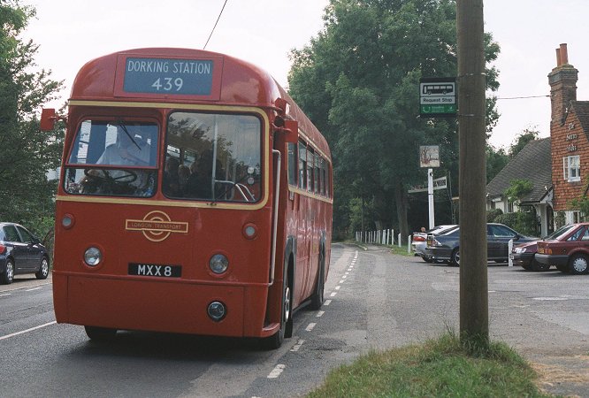 On arrival at Capel RT604 disgorged many of its passengers before executing the turning manoevre: a reverse round a corner. With a tall hedge a conductor was not only a regulatory requirement but essential! With blinds reset RT604 pulled across the junction to the bus shelter and reloaded for the northbound trip. I wondered whether to jump ship part-way and flag down XF3, but in the event I left it too late and the Fleetline sailed past southwards. I stayed on RT604 back to Dorking. RF366 round the Newdigate LoopI alighted from RT604 with just time to dash across to the departure stop to catch RF366, which was just about to set off on a widdershins trip round the 439 loop. As we set off red RT2043 dashed in on a 93 working. Again we braved the horrors of the High Street, meeting one of Tellings-Golden Miller's brand new Dart Caetanos on the 465 route on the way. We turned up past the ex-bus station and headed south to Holmwood Station. This time it was the returning XF3 that we passed as we turned out onto the A24.RF366 turned off through Beare Green. On the more relaxed back roads there were a series of photo stops along the way, at Newdigate, Parkgate and at the delightful green in Brockham. Completing the loop back to Dorking, the crew avoided the right turn into the base by turning right at the preceding roundabout, and looping right round the base site to approach from the west. GS13 was just about to go out on another Ewhurst run. Part 4: Epsom recall (RT113, RF679). |