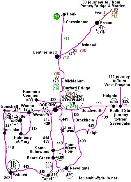 Routes93: Putney Bridge - Morden - Epsom - Leatherhead - Dorking412: Dorking - Holmbury St.Mary - Sutton 414: West Croydon - Redhill - Reigate - Dorking - Capel 425: Dorking - Gomshall 433: Dorking - Ranmore Common 439: Redhill Stn - Leigh - Brockham - Dorking - Beare Green - Newdigate - Brockham - Dorking 448: Gomshall - Peaslake - Ewhurst 449: Dorking - Chart Downs - Four Wents Pond - Capel - Ewhurst 470: Dorking - Leatherhead - Epsom 852: Ewhurst 712: Luton - London Victoria - Morden - Leatherhead - Dorking 714: Richmond - Kingston - Surbiton - Hook - Leatherhead - Dorking Tour: Dorking - Denbies Vineyard 32: (Memory Lane): Guildford - Gomshall - Dorking Stn 70D: (London Central): Brixton - Morden - Dorking |