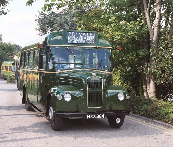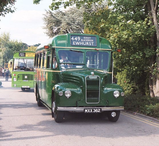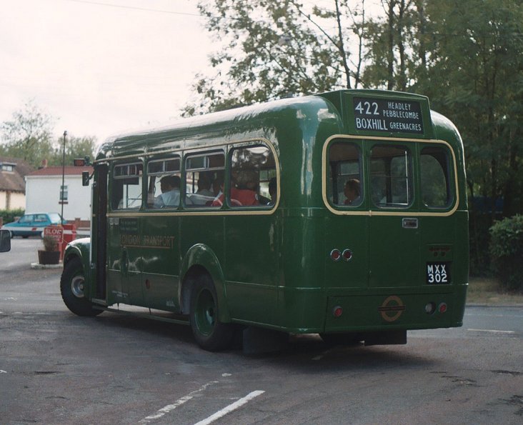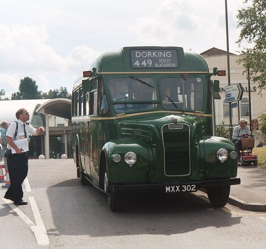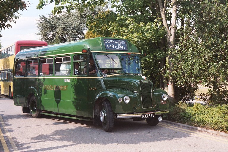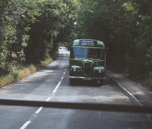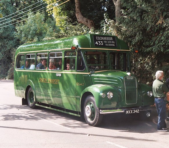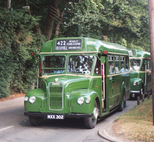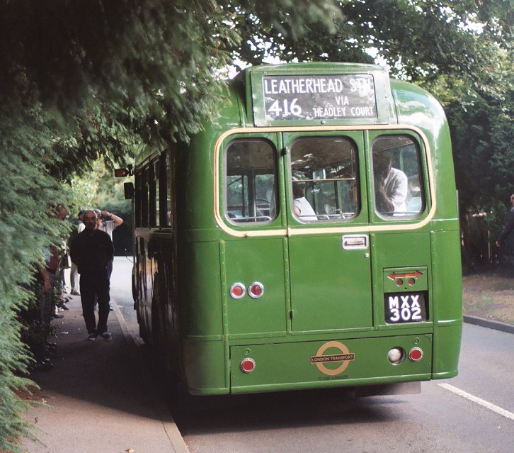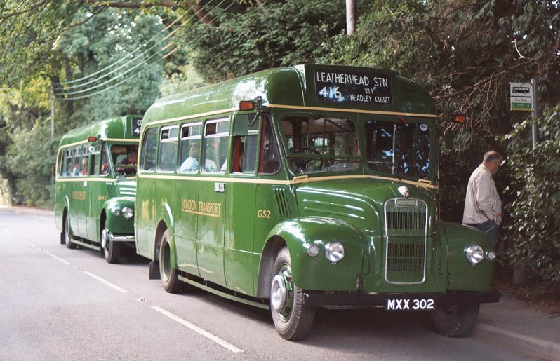 We returned to Pippbrook, and after a very short break headed out onto the stop. We were relieved to find that GS42 was coming too, and it pulled up behind. Just as well, as there were nearly two full loads for this special trip. The first part was a "garage run" to get to Leatherhead. The two Guys roared north up the main road through the Mole Gap, then sedately wound their way through the traffic maze of Leatherhead to the dank cutting alongside the railway near Leatherhead Station.