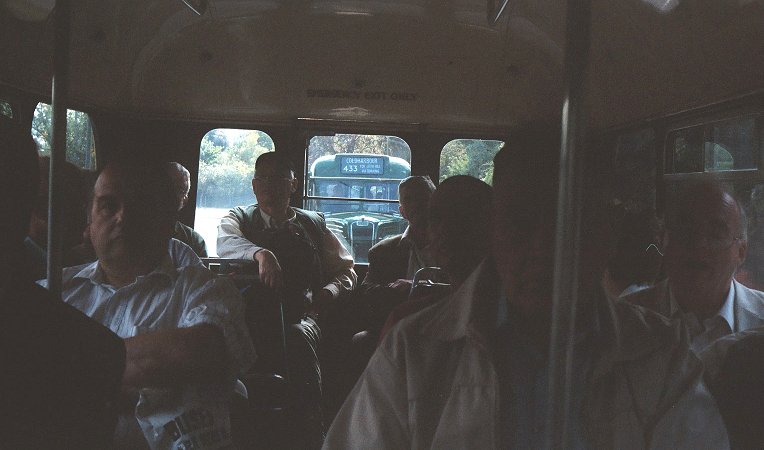 On arrival, most passengers alighted to watch the buses make their reverse turns round into a side-road, before pulling out onto the stop. The return was to be on the slightly different 416 route, so the blinds were changed, photographs taken, and the buses reloaded for the return trip.