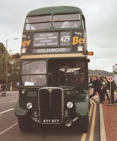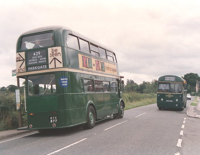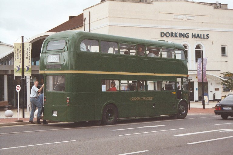 RT3148 was already on the route, coming in from South Holmwood. At Dorking Pippbrook it stopped to change drivers, Peter Aves taking over the wheel from Colin Rivers. A good load boarded, most going upstairs, and I slipped into a rear seat downstairs to change films - both cameras!