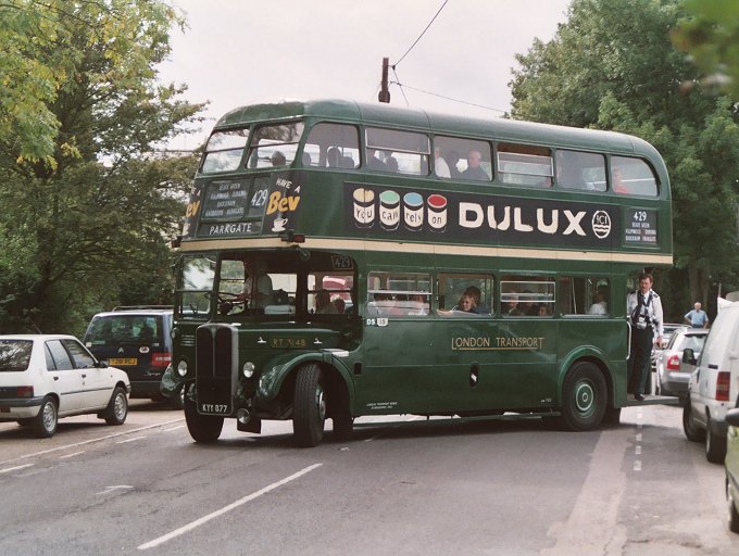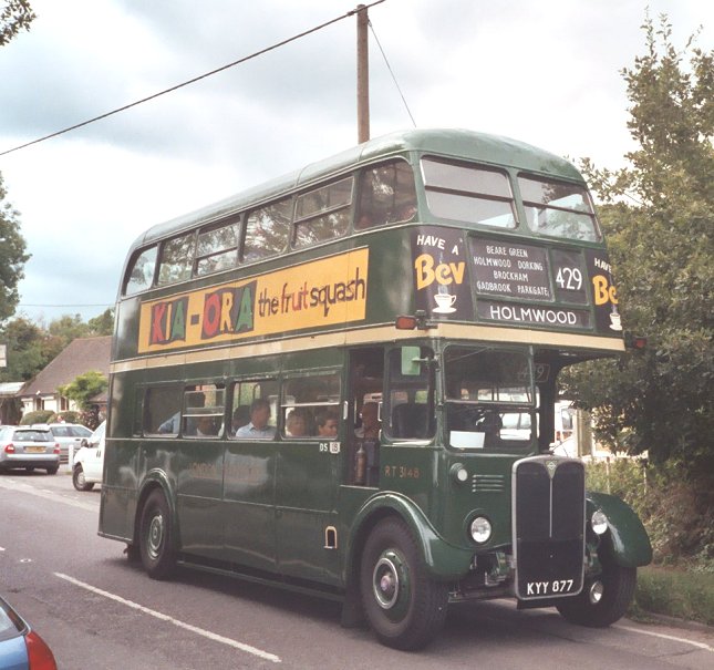 The section on to Parkgate was not free of overhanging trees, so Peter drove more cautiously while the conductor walked ahead on the dodgier sections to warn of the heavier problems. But apart from a few rustles on the roof the RT proceeded without difficulties or dome-dents, and turned right to run along to the Surrey Oaks pub at Parkgate.