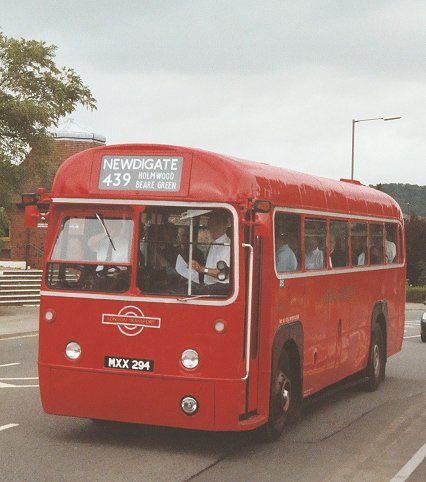 There was no opportunity to "capture" the bus crossing Brockham Bridge, but Peter stopped the big green machine at the bus stop Strood Green for the benefit of photographers. Just as we were boarding again RF626 came the other way on a 439. The RF proceeded to make a circuit of the green before heading on for Dorking. The RT headed on south, soon passing one of the red RFs coming the other way.