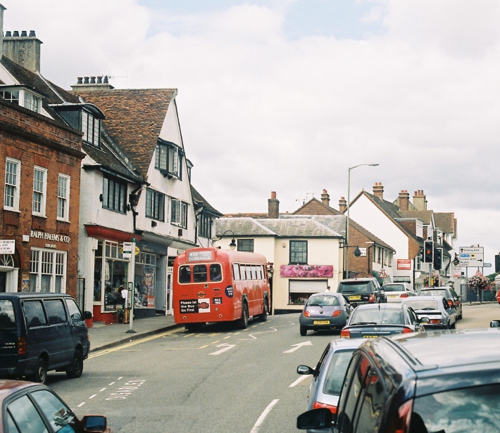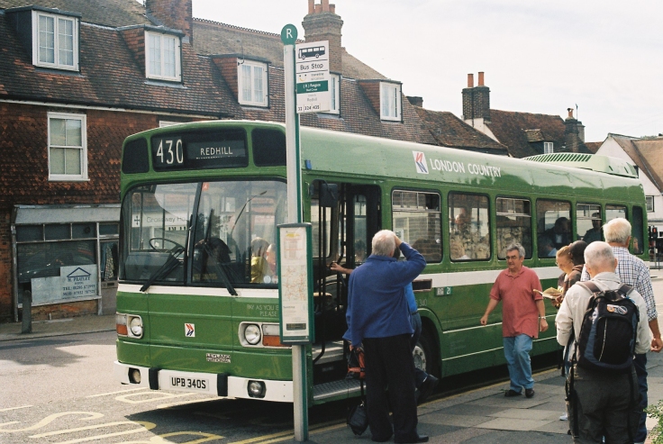 We headed west through Redhill town centre and towards Reigate. But this service forked left on the approach to Reigate, to reach Blackborough Road and drop down past the erstwhile bus garage. We turned right into Bell Street and climbed up into the town.