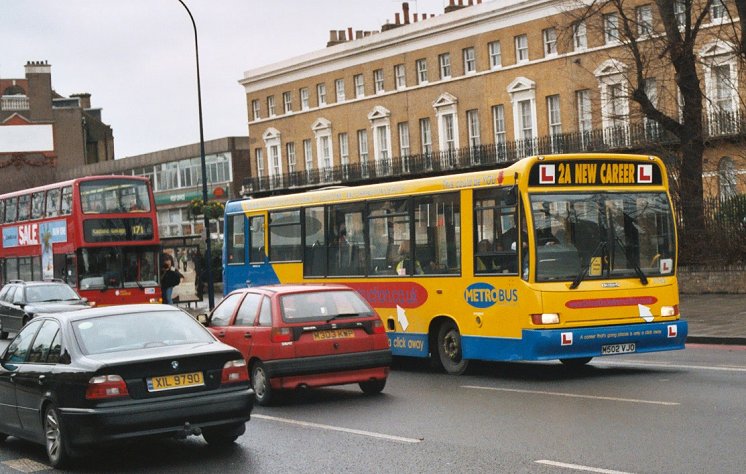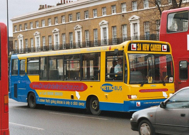Metrobus 762-9, 7762-9Metrobus bought eight of the City of Oxford Darts in March 2001, for use at Crawley. By the end of 2004 they had all been superceded by newer buses, and the decision was made to use them to replace the 9.0m Darts in the training fleet by these longer buses. Consequently all eight were repainted in a new yellow with blue training livery and sign-written accordingly. After initial introduction to training duties they were allocated 7762-5 at Lagoon Road (Orpington), and 7766-9 at Crawley.Training duties take the buses and trainees into London as well as the suburbs. On 28th January 2005 7762 and 7763 took a break at Camberwell Garage, and shortly afterwards were seen passing New Cross Garage.