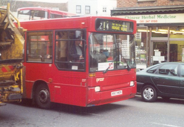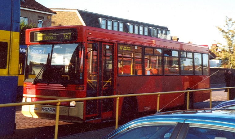 9/92 in service on 214 to Liverpool Street Stn: yellow/maroon/badger $