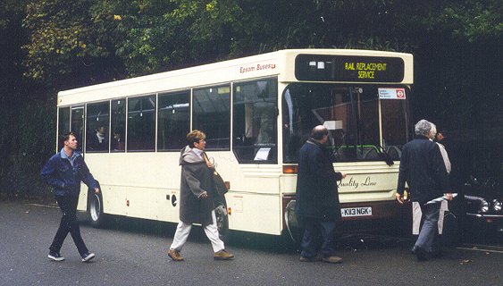Epsom Buses Dart at Weybridge Station, replacing the eastbound suburban rail service, October 1999.