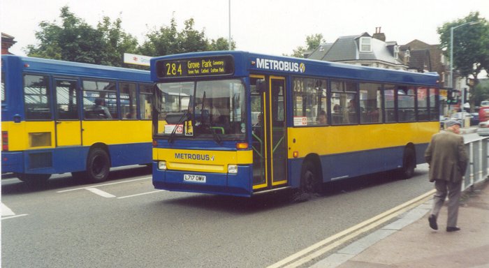 heading for Downham way on the 284, and 717 slips round the corner heading for Grove Park Cemetery. Sept 2000.