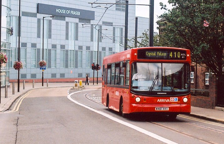 Winter in Croydon on the 407: ADL18 crosses the tram-lines at George Street heading south, and a mucky ADL15 pulls out of West Croydon Bus Station.ADL14 heads for West Croydon bus station and Sutton, September 2009, wearing plain red and a white roof.