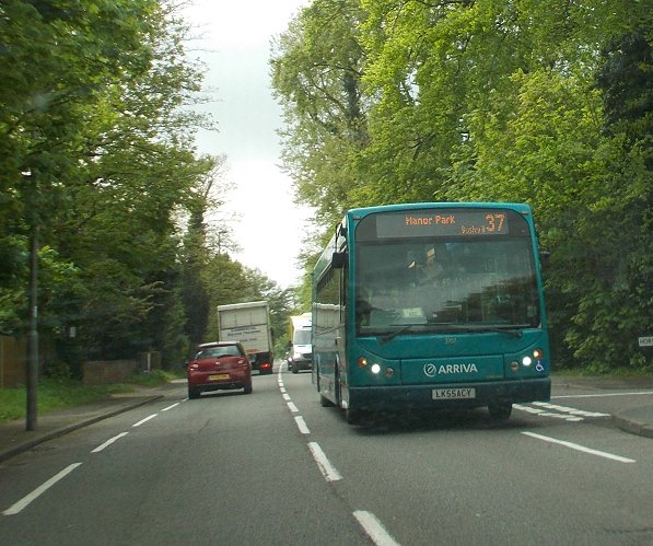 Clipped-wing Pegasus: 3707In summer 2010 Surrey County Counncil abandoned its expensive policy of carrying all primary schoolchildren safely to school by bus, in a dedicated fleet of modern buses - the Pegasus scheme. The buses, 11.3m Super Darts with East Lancs bodywork, that had been operated by First Beeline, were dispersed to Surrey operators. DME43911 was Arriva's share, becoming 3707.3707 heads east along the A25 on route 37 to Manor Park, April 2014 (photo by Cynthia Smith)