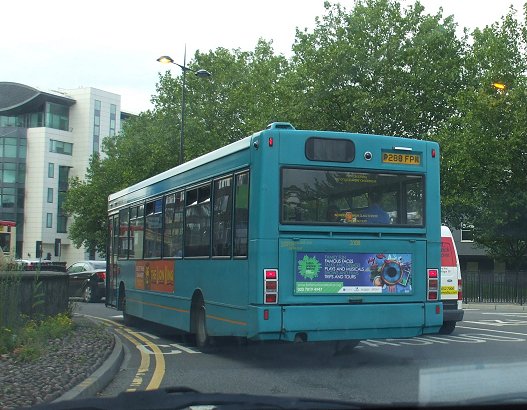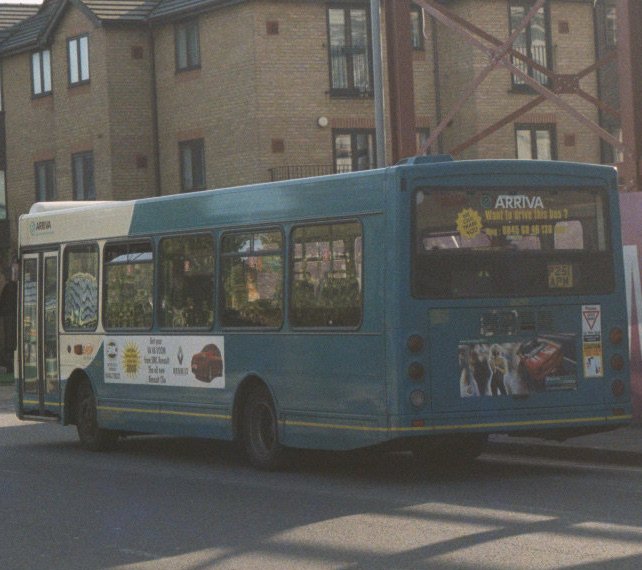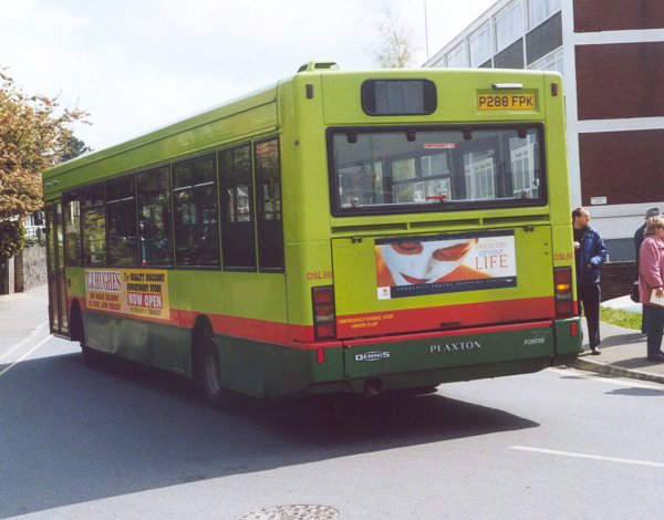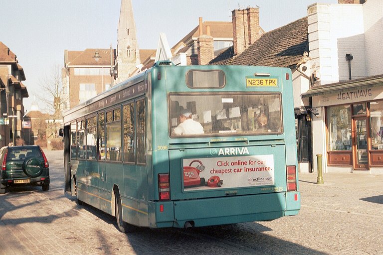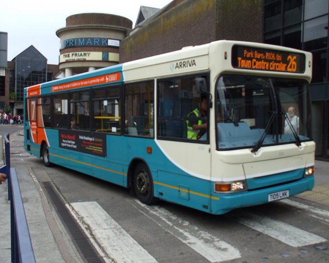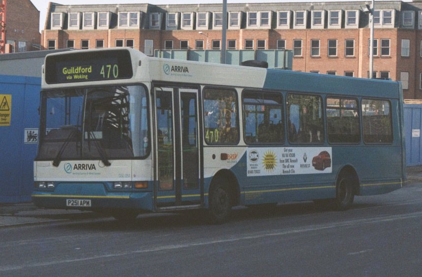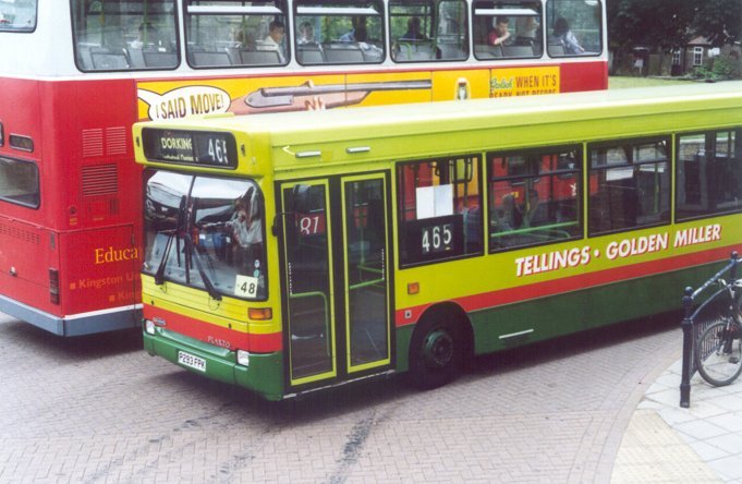 Already operating in the shade, DSL51 in Kingston on the 470, in October 2001.But Surrey was proving to be difficult bus operating territory, for companies both large and small. Early in the new millenium the system was being cut back, both in terms of route coverage and service frequency. By 2002 some of the Sprytes were redundant. Woking garage closed in March 2002. Three Sprytes went to Arriva Kent and Sussex, and one to Northfleet. Seven newer Plaxtons came back from loan to Tellings-Golden Miller in July. Eight Sprytes went to Arriva Midlands North in December. Another two went to Arriva Medway Towns in March 2003. DSL52 died of fire damage in June 2003. The remainder worked on. Some of them, plus some of the others still in Southern Counties, were shifted around Southern Counties, including Grays, as required, some coming back to Guildford at times.The last three left Guildford for Arriva Medway Towns in early 2009. DSL68-DSL110: long Plaxton Pointers