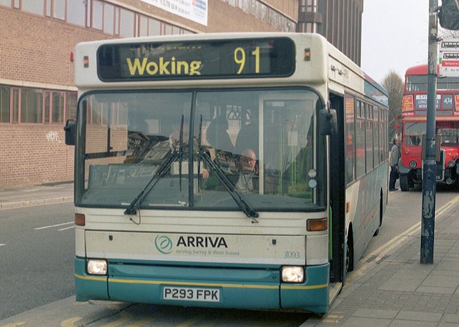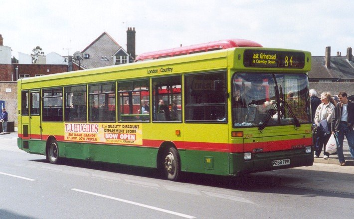 Four (97-100) were in a green and yellow livery for the Guildford Link park & ride service. Seven (90-96) came to London & Country at Leatherhead for London route 465 (Kingston - Dorking). This essay into London tendering became untenable when Leatherhead garage closed in May 1999. The route passed to Tellings-Golden Miller, together with the seven buses on long-term loan. These were kept in London & Country green/green/red, but with Tellings-Golden Miller fleetnames. T-GM renumbered them 590-596. They stayed with T-GM for just over three years, until July 2002, when they were returned to Guildford. 596 crosses Kingston Bridge, almost at the end of a trip on the 465 for Tellings-Golden Miller. 593 turns the corner in Kingston.68-89 and 101-108 were new to Guildford & West Surrey. Very soon many of them were established at Crawley, especially the lower-numbered of the batch. When Crawley garage closed, passing all its work to Metrobus, in March 2001, many went to Horsham (aka Warnham Station) for continued work in West Sussex, while seven were passed to Arriva Medway Towns at Gillingham.Two more, 109 and 110, were added to the fleet in March 1999 to supplement the Park & Ride bunch in yellow and green Guildford Link livery. DSL88 rejoiced in the London & Country livery back in April 2000, when at East Grinstead on the 84. When seen in Guildford in August 2009 it was back in dull Arriva livery, having been for a while in two-tone green (plus cream) as a celebration of Aldershot & District.As the old London & Country withered away the long Dart SLFs became the longterm stalwarts of the fleet, with DAF Cadets and the shorter Dart SLFs coping where the longer buses feared to go. Horsham garage closed in October 2009, with some Dart SLFs bought by Metrobus. Some were kept, some were sold. Those at Guildford just kept on going. In September 2008 some of the Guildford buses were branded with a bold orange swoosh advertising a 7-minute frequency to the University of Surrey.3093 calls at Woking Station on a Sunday working of the 91, in April 2007, with RTL139 behind. 3099 is at Horsham Bus Station in company with RF626 in March 2006.3109 shows the University of Surrey flashes, offering a 7-minute frequency, in September 2010.DSL591-DSL592: Surrey's long Plaxton Pointer 2s