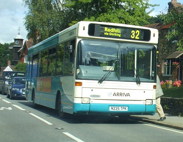 However, operational difficulties led to London & Country giving up the route in November 1996. The route went to Centrewest at Alperton together with the twelve dedicated Pointer-bodied SLFs on long-term loan and three of the East Lancs-bodied SLFs on short-term loan. The buses retained their green/green/red livery. They returned to Greenford in 1997 when London Buslines took over responsibility for the 105. In February 1998 London Buslines returned them to London & Country. They seem to have gone mostly to Woking, where they assisted in the major clearout of older rolling stock that Arriva & West Surrey had when it downsized operations at Guildford and Woking in July. Arriva turquoise and champagne livery displaced the older livery. In early 2001 most of this batch were transferred away from Woking (or Guildford) to Horsham and Cranleigh, presumably in anticipation of Arriva's desertion of Crawley, and in response to the demise of Tillingbourne in the Cranleigh and Dorking areas. One (DSL34) went off to Northfleet, where it became 3172. The others worked on around the Surrey and Sussex Wealds, mostly at Cranleigh and Horsham. 3036 in Horsham on a Sunday working of the 86, in March 2006. It wears branding for the 53 and 63.Renumbering, to 3025-3033, 3035-3036, followed in April 2005. 3027 and 3029 went to Arriva Medway Towns in early 2009, and 3032 was sold to Metrobus along with the Horsham operations in September 2009. They found the thirteen-year-old good enough to keep and repaint into two-tone blue, as their 396. 3035 and 3036 were likewise found good enough by Cranleigh to merit a face-lift in August 2009, fitting them with shapelier Pointer 2 fronts in place of the square "shoebox" front.August 2009 on the A25 (pictures by my wife): 3025 pauses at Gomshall on an eastbound 32. 3032, only a few days before being bought by Metrobus, looks as though it has just come from an overhaul at Guildford and is heading home to Horsham.DSL37-DSL55: East Lancs SprytesNew: Plaxton-bodied DSL85 and East Lancs-bodied DSL44 at Showbus 97. The latter carries a sticker proclaiming it to be the 100th Dennis Dart SLF to be built.London & Country had had a policy of buying bodywork by East Lancs - Greenway rebuilds, Lances, Falcons and Darts. Now East Lancs produced the Spryte body for the Dart SLF, so it was no surprise that in July 1996 the first of nineteen 9.4m 31 seaters appeared here. The batch was divided between three of the subsidiary companies: Guildford & West Surrey took twelve, London & Country three, and Horsham Buses four. The London & Country three went to Greenford to join the Plaxtons on the 105. The Guildford & West Surrey buses went to work on the 44, 58, 91, 534, 539 and 581, appearing in evenings and on Sundays on the 28 and 34.Whilst the sun still shone on the class, DSL38 on the X38 in East Grinstead, April 2000.The London & Country three were loaned briefly to Centrewest when London & Country gave up the 105. The smallish Darts were well used around the system, and were early repainted into Arriva livery.