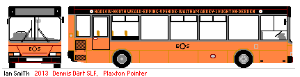 Swallow Coach Company: EOSThe Swallow Coach Company of Rainham stepped in to fill the partial vacuum created on the fringes of Essex by the departure of Travel with Hunny. Apart from double-deckers to deal with schools contracts, the company also provided three Dart SLFs for Route 66 (Harlow - North Weald - Epping - Upshire - Waltham Abbey - Loughton - Debden). Although a unique through route, it faced competition on four of its stages by other companies. To service it Swallow acquired three long Dart SLFs that came from recently demised (and much lamented) Pennine Motor Services. They kept the striking orange, grey and black Pennine livery, adding a route band along the roofline and EOS fleetnames. Route 66 began ooperation at the beginning of September 2014. A Marshall-bodied Dart SLF, once with Metroline as DML46, arrived in October 2014 for use on route 16 from Harlow. It departed in February 2015.