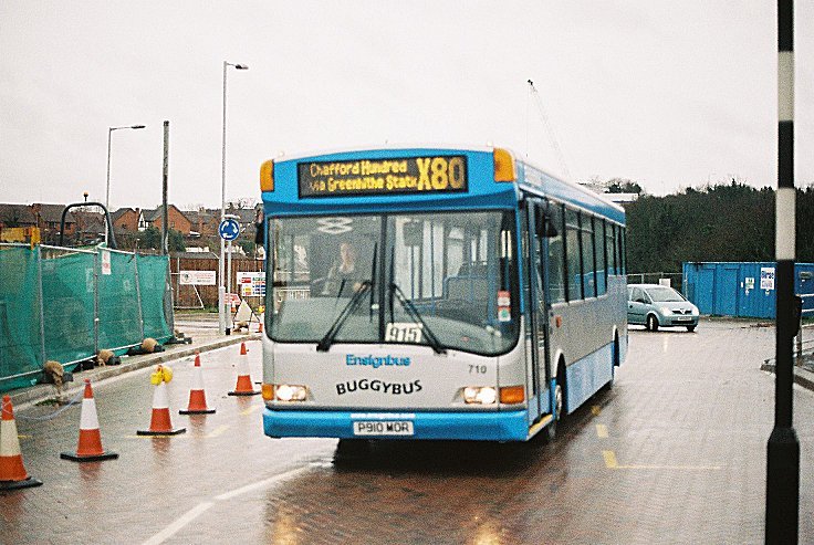 Urbanstars for the X80: 701-5, 710, 761, 783Ensignbus got back into local bus work in 2004, starting a X80 service linking Chafford Hundreds with Lakeside, and over/under the Dartford Link to Greenhithe Station, Bluewater and Gravesend. It used step-entrance Darts and B6s to start it, available from the previous contract for railway replacement between Gravesend and Strood while the railway tunnel was rebuilt.In December 2004 Ensignbus acquired six Dart SLFs with UVG Urbanstar bodies that had been in service with Natrional Express Airport. They were repainted in Ensignbus blue and silver, and given buggy-bus symbols and branding for the X80. The numbers reflected the registration marks, some of them replacing similar numbers on the displaced step-entance single-deckers. 710 and 703 on the X80 at Lakeside, December 2007, 2005 respectively.The X80 was re-equipped with four Optare Deltas in July 2006, which meant the Urbanstars lost their X80 branding so that they could start Thurrock routes 77 and 83 (Lakeside - West Thurrock - Grays - Chadwell St.Mary - Tilbury / Brentwood Rd Estate) in competition with Arriva Southend's 377 and 383.705 was damaged by a reversing crane in Gravesend in July 2006, which peeled off part of the roof, necessitating a repair! The damaged Dart was substituted by a loaned SLF from the sales fleet. Two more Urbanstars were acquired in May 2007, becoming 761 and 783. 761 at Lakeside, December 2007.Most of the Urbanstars were sold in early 2009, 783 to Travel with Hunny, 701-5 and 761 to Arriva Midlands. The last, 710, stayed until July 2010, before going to Renown in Bexhill.