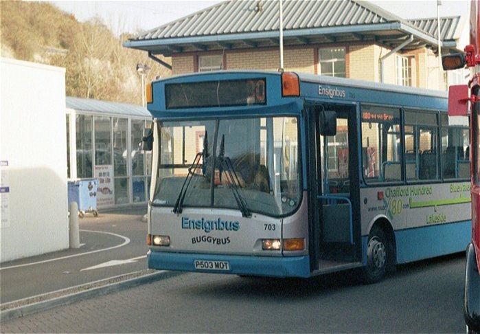 Another Plaxton Pointer: 700A further Pointer2 was taken on by Ensignbus in April 2006, third-hand from Scotland. It was returned to its original registation (V800 CBC), and was numbered 700.It lasted in operation until October 2008, when it was replaced by a Volvo B9TL, and sold to AM-PM Travel in Birmingham. Ex-Metroline Dart/Marshalls: 719-727, 729-732 and 738