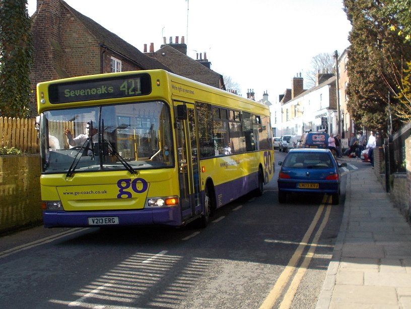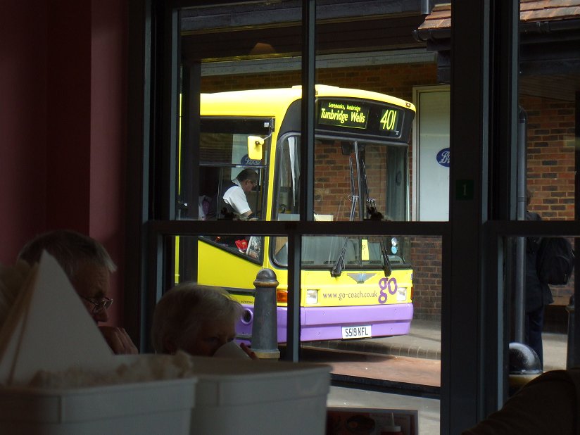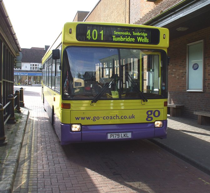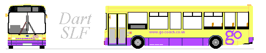 DMS19A low-floor Dart/Marshall was acquired in October 2010. Once Metroline DMS19, it had spent a couple of years in the West Midlands. Now the 9.3m bus was painted in Go-Coach livery - a startling yellow and mauve, with a large Go logo. It wanted to be noticed! This became the regular bus on the Kent contracts.DMS19 on the 401, glimpsed from the cafe in Sevenoaks bus-station in May 2010, and at rest in Otford garage, May 2012.3179A longer but older bus was acquired in early 2010. 3179 had a fascinating history, much of it in the surrounding area. Starting with Maidstone & District in 1996, the 10.6m Pointer had transferred in 1998 to Dartford, with Arriva Kent Thameside, where it donned Arriva turquoise and champagne. Dartford had it painted red in 2003 for service on TfL services. It had then yo-yo-ed across the Thames between Dartford and Grays, before going on loan to Horsham, where, still red, it acted as spare for the 465 contract. When not needed for that, it worked Park & Ride duties. Metrobus took over the 465 in 2009, together with its buses, including 3179. It moved to store at Crawley, then fairly quickly via Stafford Bus Centre to Go-Coach.It was repainted yellow and mauve. Whether Kent objected to the livery on its trunk 401 route or what, just a few months later it went into very dark green with Kent Invicta logos. 3179, in its short-lived Go-Coach livery, at Sevenoaks Bus Station on the 401, May 2010, and a year later in the County Links livery for KCC..3593A younger, 10.7m Pointer2 came to join 3179 ready for the daily takeover of the 401 in April 2010. 3593 was owned by Kent County Council, and came on loan. It had previously been on loan to Southlands Coaches, Metrobus, and Arriva Southern Counties, mostly on the 401. Now it was GoCoach's turn. It went from Kent's insipid white branded livery into the dark green with white Invicta's.3593 in its Arriva Kent & Sussex days at Sevenoaks Bus Station on the 401, May 2008.DLD95, 96In October 2010 Go-Coach bought a pair of 10.1m Pointer2s from Metroline, where they had been dual doorway DLD95 and 96. Go-Coach had the centre doorways removed, and yellow/mauve applied. Very smart they looked too.Taking a Sunday break in the garage at Otford, DLD95, in May 2012.SPDs2013 saw a need for some larger single-deckers on long country routes, and in the Tunbridge Wells area, and Go-Coach acquired a pair of 11.3m SPDs from Go-Ahead North East (V212/3 ERG).SPD V213ERG (ex Go-Ahead North-East 8213) took me from Farningham to Eynsford Station in March 2013.DartIn January 2014 Go-Coach increased the frequency on the Dartford local route 453, renumbering it Dart1 and Dart2. To promote the service Dart MPDs V305MDP and YT51EAC (both acquired during 2013) were repainted overall purple with a white Dart along the flanks.Expansion in 2014Go-Coach continued to expand its business in 2014, winning more Kent County tender awards. More Darts were bought, three of them short buses from West Midlands Special Needs Transport (two MPDs and a Wright Crusader). Ex-Eastbourne Cadets were also acquired.